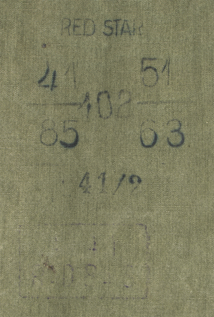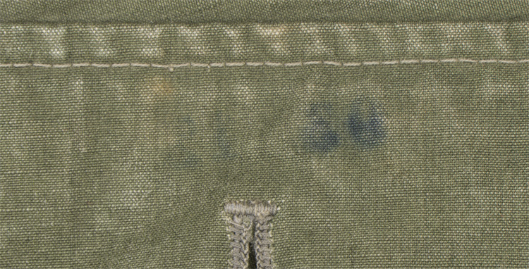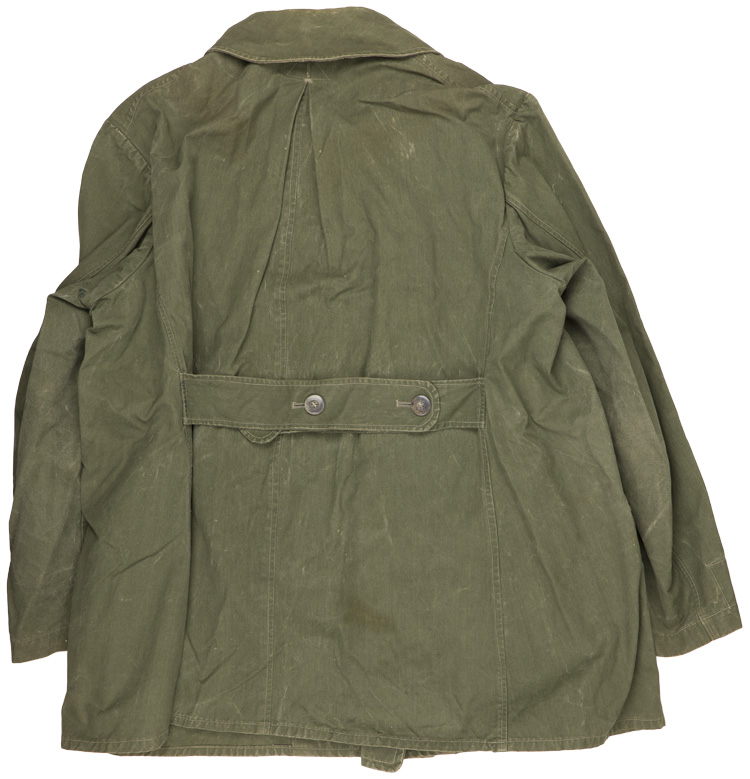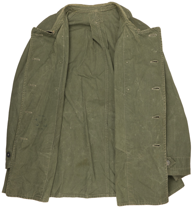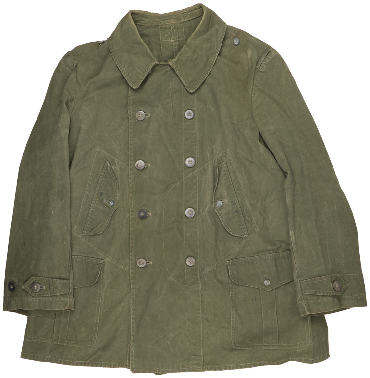 PHYSICAL DESCRIPTION: Olive drab, waterproofed, cotton duck construction, three quarter length, double breasted style, Mountain trooper’s wind jacket with small, fold back, lapels and a large, lay down collar. The jacket features dual, vertical, parallel, rows of five, front closure buttons with the corresponding button eyelets on the left front panel. The jacket also had a single, metal hook and eye positioned at the forward neckline for a secure closure. The jacket has two, slightly diagonally angled, slash, lower breast pockets and two, pleated, horizontal, patch, hip pockets all with scalloped, button down, flaps. The jacket has no breast eagle as per regulations. The dual-ply, straight cut, sleeve cuffs each have a horizontal, fit adjustment strap, with a single button eyelet, machine stitched to the inner seam with dual, corresponding, fit adjustment buttons to each. The reverse of the jacket has a central, vertical, machine stitched seam, an opened, reverse pleat to the upper section and a non-adjustable, half-belt with two ornamental buttons, machine stitched to the side seams at the waistline. The jacket has cotton shoulder strap/board retaining loops and buttons intact. The large, lay down collar has no collar tabs or any evidence of any ever having been applied, as per regulations. The reverse of the collar has the typical zig-zag reinforcement stitching and an extended, fabric tab with a single button eyelet and corresponding button beneath the left side with an additional corresponding button beneath the right side for a secure neck closure in inclement weather. The unlined interior of the jacket has dual-ply, front closure panels. Nice maker, size and 1941 Depot markings. The front closure, pocket, cuff and half-belt buttons are all the large, molded, black bakelite type while the shoulder strap/board buttons are the smaller, molded black bakelite type and all but one shoulder strap/board button appear to have their original stitching. The wind jackets were designed large enough to fit over the standard field uniform and this example is roughly size 44" chest. Nice worn and used example showing the expected age and wear.
