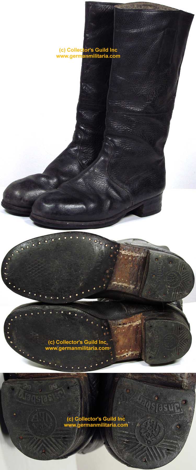 BACKGROUND: Besides the helmet, the tall, blackened leather boot is probably one of the most instantly recognizable items of the German military. However the German’s concern with leather shortages was evident as early as September 1939 when issue of the traditional tall leather marching boot was restricted to personnel serving in the field. Regulations in November 1939 shortened the tall leather marching boot in an attempt to conserve leather. Additional regulations in August 1940, introduced the canvas gaiters to be worn with the short lace up ankle boots, and issued to all second line troops in a further effort to conserve leather. By 1941 the short lace up ankle boots and gaiters were issued to all new recruits in place of the marching boot as a cost and leather saving technique. By 1943 with increased leather shortages the gaiter’s and lace up ankle boots were issued in ever larger quantities and production of the tall marching boots was discontinued altogether. Officer and certain senior NCO ranks were responsible for purchasing their own uniforms including footwear and as a result were allotted a clothing allowance through the army’s Kleiderkasse, (Clothing Account), system. The Officers and certain senior NCO’s could choose to purchase their footwear from the armed forces clothing depots or to privately purchase footwear of higher quality. Although enlisted personnel were issued their footwear from government supplies they were also permitted to purchase privately manufactured footwear although the price may have been restrictive. This example is quite unusual in that the interior calves are lined in mottled, grey wool.