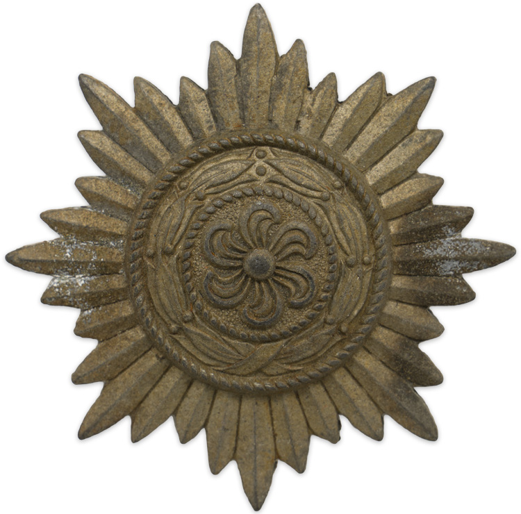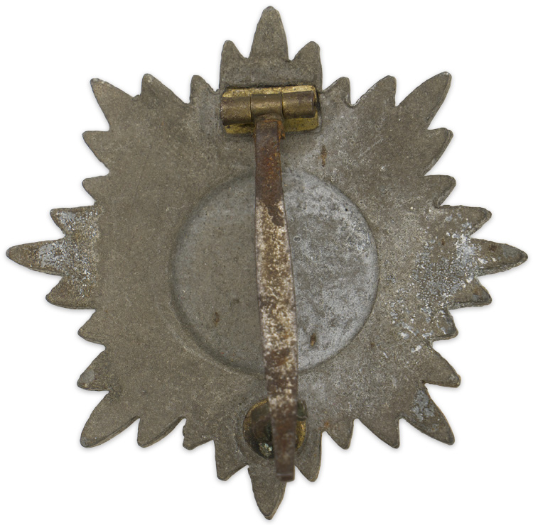 PHYSICAL DESCRIPTION: Die struck, zinc alloy construction award with a gilt wash is in the form of a thirty-two point, sunburst star pattern with a central, embossed, circular, laurel leaf wreath encompassing a six petal flower. The reverse has the typical circular depression to the center as found on these awards. Complete with original hinge, pin and catch assembly.