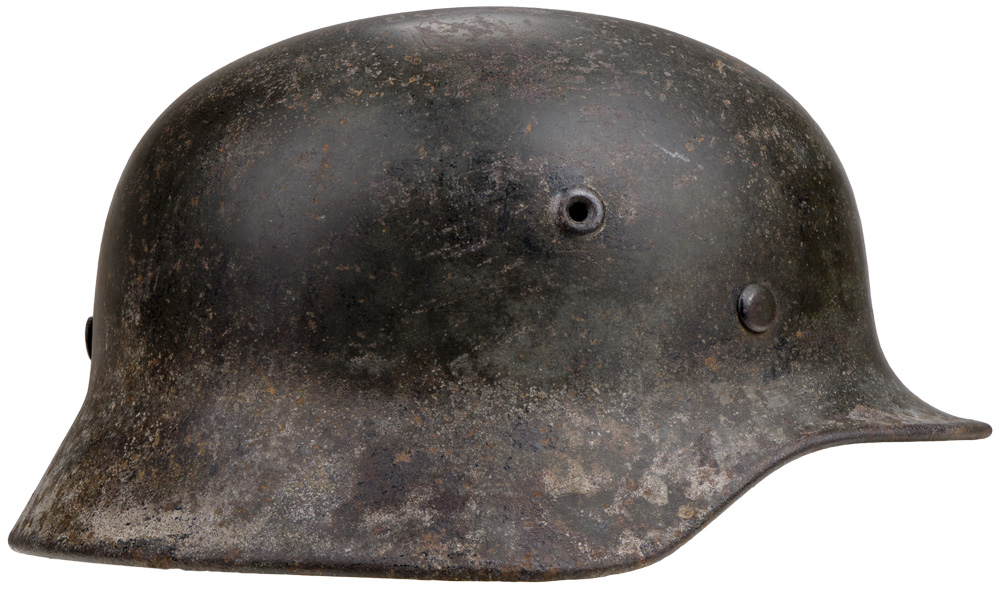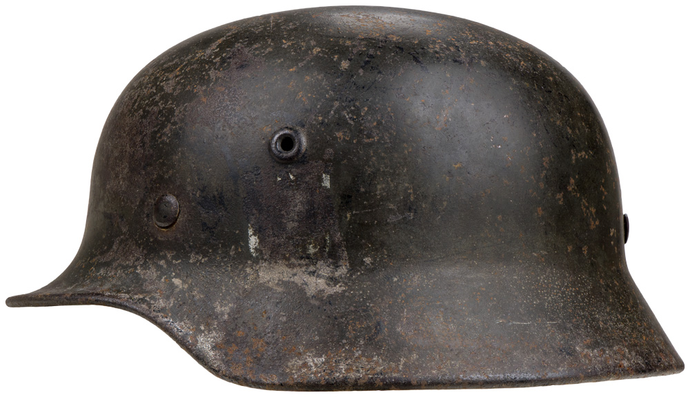 BACKGROUND: The first "modern" steel helmets were introduced by the French army in early 1915 and were shortly followed by the British army later that year. With plans on the drawing board, experimental helmets in the field, ("Gaede" helmet), and some captured French and British helmets the German army began tests for their own steel helmet at the Kummersdorf Proving Grounds in November, and in the field in December 1915. An acceptable pattern was developed and approved and production began at Eisen-und Hüttenwerke, AG Thale/Harz, in the spring of 1916. These first modern M16 helmets evolved into the M18 helmets by the end of WWI. The M16 and M18 helmets remained in usage through-out the Weimar Reichswehr era and on into the early years of the Third Reich until the development of the smaller, lighter M35 style helmet in June 1935. In an effort to reduced construction time and labor costs minor modifications were introduced in March 1940 resulting in the M40 helmet. Further construction modifications were undertaken in August 1942 resulting in the M42 helmet. Originally the Third Reich national tri-color helmet decal was introduced on March 14TH 1933 for wear on the left side of the helmet to replace the Reichswehr era state shield insignia. Regulations of February 17TH 1934 introduced the Wehrmacht eagle decal and the national tri-color decal was shifted to the right side of the helmet with the Wehrmacht eagle decal positioned on the left hand side. Regulations of March 21ST 1940 dictated that the national tri-color decal was to be removed from all helmets and further regulations of August 28TH 1943 abolished the Wehrmacht eagle decal and dictated that it was also to be removed from all helmets although the directives were not completely adhered to.
