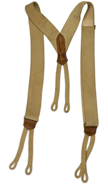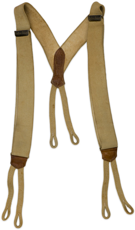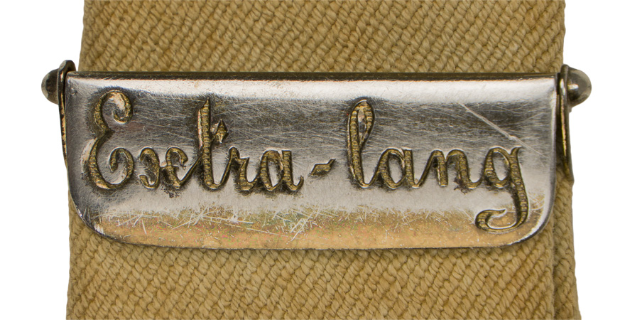 Extra wide, heavy duty pair, grey with dark blue vertical stripes. Adjustment bars marked "Extra Lang" ("Extra Long"). Elastic still stretchy. Excellent condition.