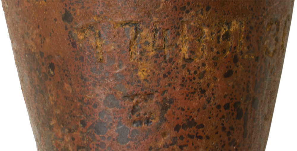 PHYSICAL DESCRIPTION: Roughly, 21cm tall, tooled steel construction 5cm light mortar shell with a flat tipped, tapered, screw on molded black bakelite M34 fuse tip. The shell body widens out from tip and tapers back down into the cylindrical finned tail piece. The round still retains about 80% of its original protective, reddish/brown primer paint with light surface spotting. The round is profusely marked with black ink stamped and impressed markings.