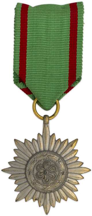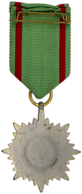 PHYSICAL DESCRIPTION: Die struck, zinc alloy construction award with a gilt wash is in the form of a thirty-two point sunburst star pattern with a central, embossed, circular laurel leaf wreath encompassing a six petal flower. The reverse has the typical, circular, depression to the center as found on these awards. The top center of the award has an integral, extended, vertical, arm with a looped ring to secure the ribbon suspension ring. The ribbon suspension ring is intact and comes complete with an original piece of horizontally ribbed, green, rayon ribbon with a vertical, red stripe near each outside edge. The ribbon has a brass pin back device hand stitched to the reverse top edge.
