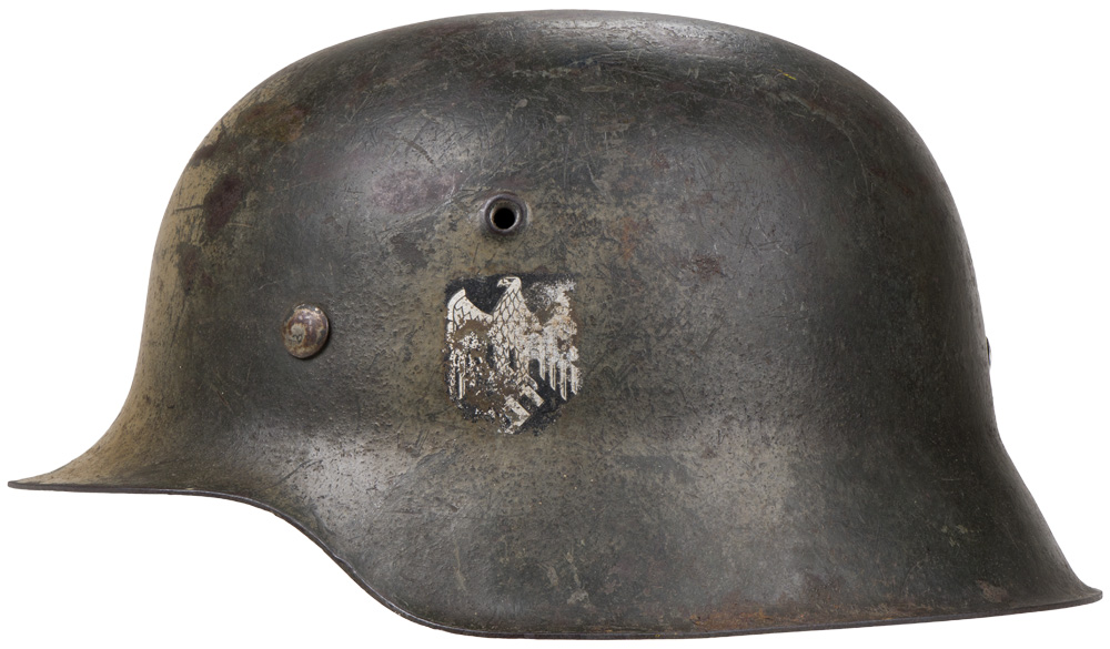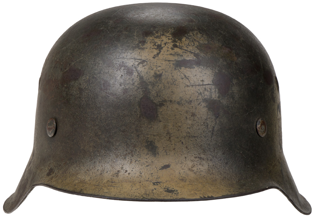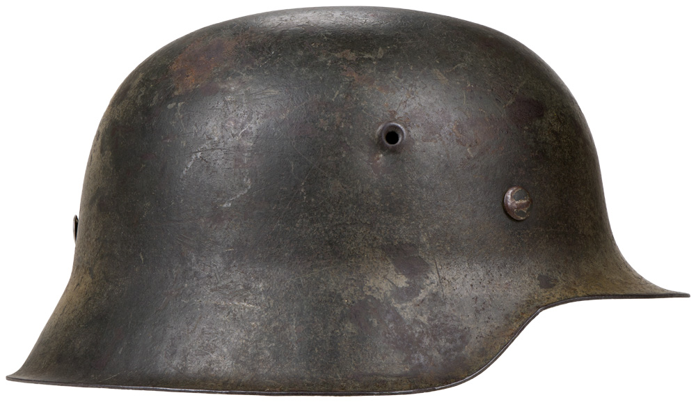 BACKGROUND: The first "modern" steel helmets were introduced by the French army in early 1915 and were shortly followed by the British army later that year. With plans on the drawing board, experimental helmets in the field, ("Gaede" helmet), and some captured French and British helmets the German army began tests for their own steel helmet at the Kummersdorf Proving Grounds in November, and in the field in December 1915. An acceptable pattern was developed and approved and production began at Eisen-und Hüttenwerke, AG Thale/Harz, in the spring of 1916. These first modern M16 helmets evolved into the M18 helmets by the end of WWI. The M16 and M18 helmets remained in usage through-out the Weimar Reichswehr era and on into the early years of the Third Reich until the development of the smaller, lighter M35 style helmet in June 1935. In an effort to reduced construction time and labor costs minor modifications were introduced in March 1940 resulting in the M40 helmet. Further construction modifications were undertaken in August 1942 resulting in the M42 helmet.