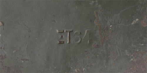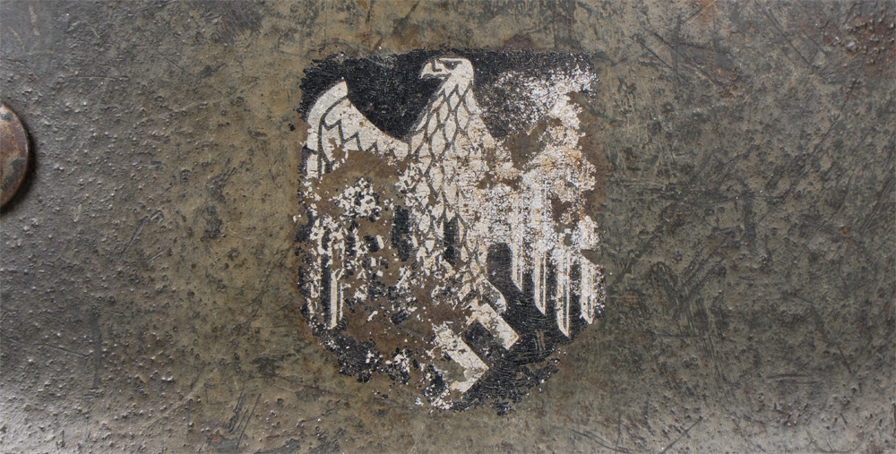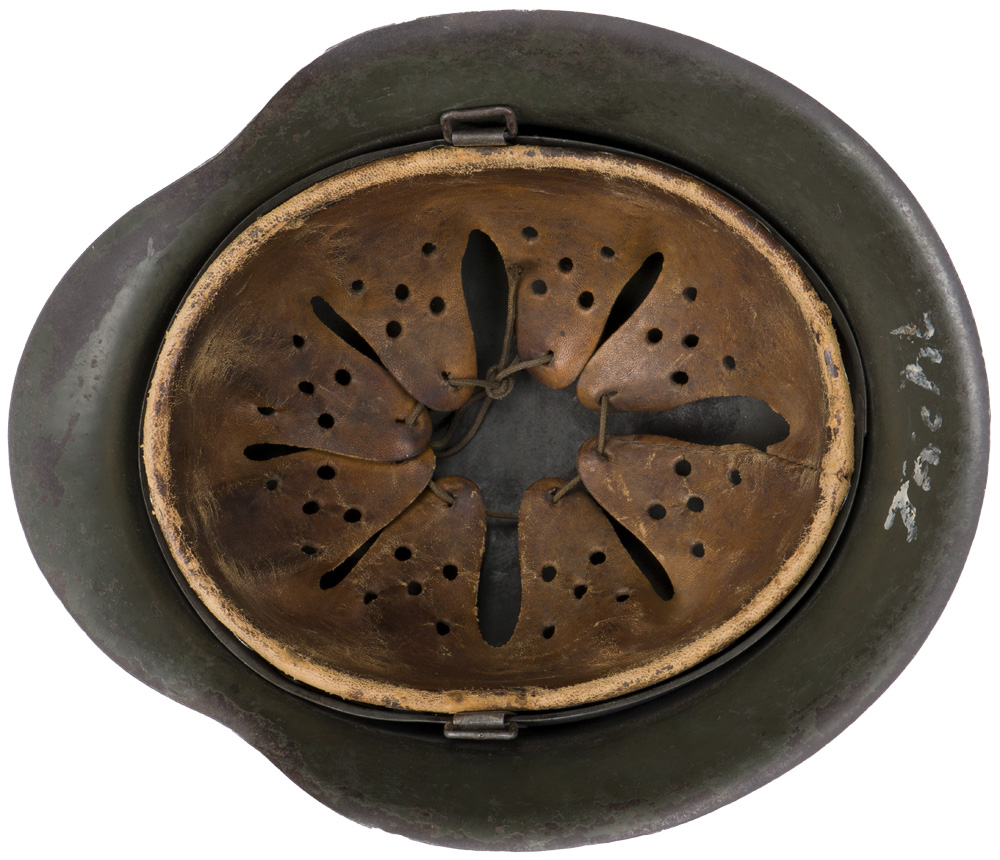 PHYSICAL DESCRIPTION: The stamped, sheet steel construction helmet retains a portion of it original camo overpaint. The left side of the helmet has an Wehrmacht eagle shield decal featuring a eagle with down-swept wings, clutching a canted swastika in it’s talons on a black, shield, shaped base. The decal is retained about 70%. All three liner retaining rivets are all intact. The interior of the helmet has a M31, tan, leather liner with all eight of its original fingers and the original tie string intact. The reverse, interior, neck guard apron has a stamped lot/serial number "1823", and the interior, left side apron has the stamped manufacturer’s code and size, "ET64", indicating manufacture by Eisen-und Hüttenwerke, AG Thale/Harz, size 64. Nice untouched M42.