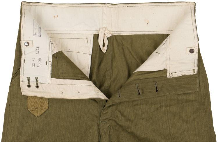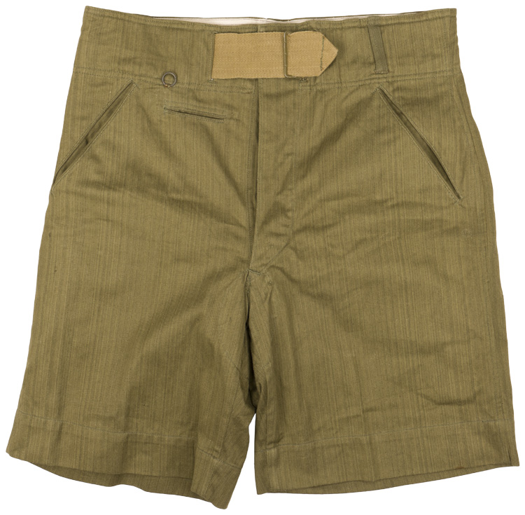 PHYSICAL DESCRIPTION: Light weight, ribbed, khaki/olive, cotton twill construction shorts feature a vertical, four button French fly with an additional two buttons positioned on the waistband (top 2 buttons are missing). All original buttons. The waistband has a tunnel looped, khaki/tan, canvas belt with an HBT, (Herring Bone Twill), weave, to the right side of the fly with a corresponding, rectangular, open, triple claw, olive drab painted, magnetic sheet metal buckle to the left side of the fly. The waistband also a single vertical belt loop to the left side to secure the belt in place. The shorts have two, diagonally angled, slash, front pockets and a small, horizontal slash, watch pocket situated below the right waistband. The reverse of the shorts have two, small, vertical, tapering darts and a horizontal slash pocket with a single button closure to the right seat. The shorts have a dual-ply reinforced crotch and hemmed cuffs. The interior waistband lining and the pocket bags are all constructed in ribbed, white, cotton twill. Some corrosion to the metal parts. Nice 1942 Depot and size markings. The shorts are roughly size 32" waist.