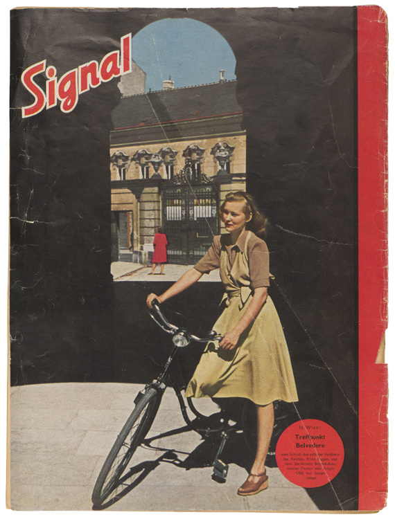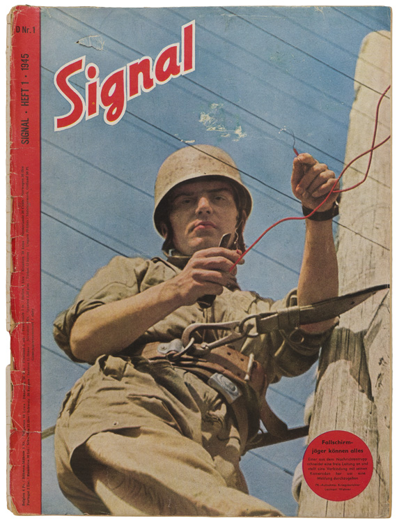 (Magazin)BACKGROUND: "Signal" magazines were first introduced in April 1940 as a bi-monthly magazine primarily containing articles and photographs compiled by German war correspondents and produced in Berlin by the Deutscher-Verlag, (German-Publishing House) under the auspices of the OKW, (Oberkommando der Wehrmacht, (High Command of the Armed Forces), with post-production censorship under the control of the Propaganda Ministry. Originally the magazine was intended to glorify the early German victories and encourage morale. Eventually the magazine was produced and distributed in at least twenty-five different languages and countries. Signal magazine was very popular and reached a subscription level of roughly two and one half million at its peak.