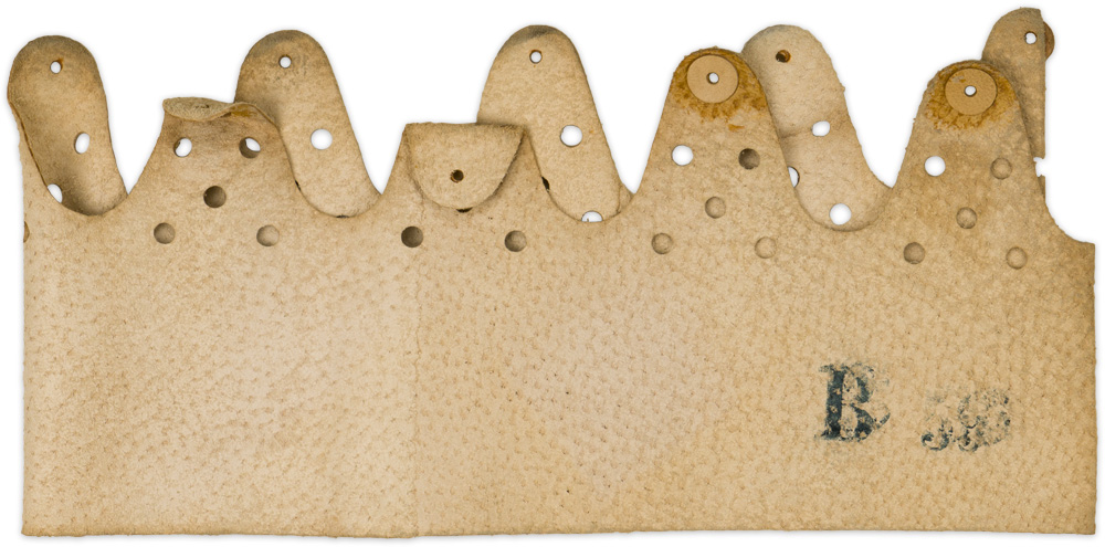 PHYSICAL DESCRIPTION: Tan leather construction helmet liner. Seven of the eight extended fingers intact. Each finger has five, punched, ventilation holes with an additional punched hole at the tip of each to insert the fit adjustment drawstring. Mark "B 59". Original near mint example from factory stock.