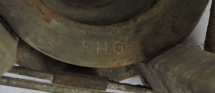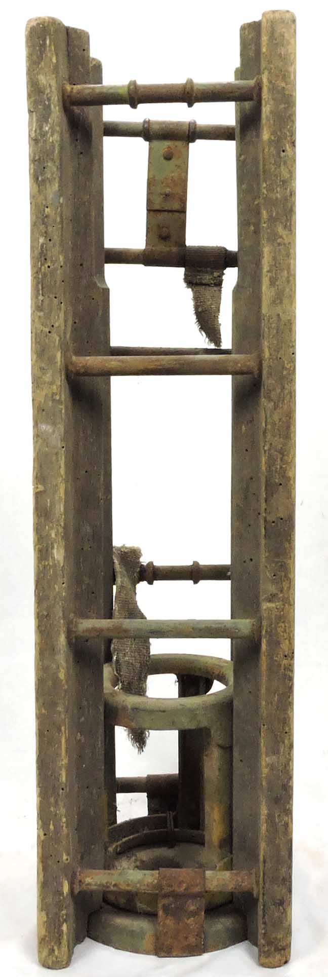 Wood and steel construction. 50cm x 16cm x 16cm. In untouched as found condition. Shows its age and wear.