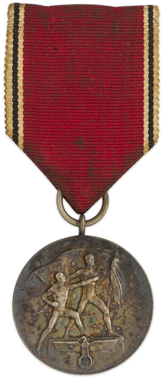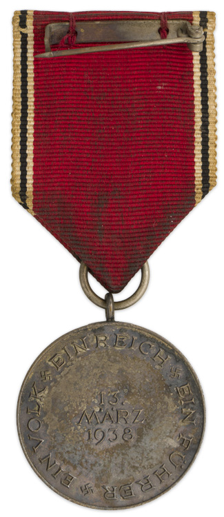 PHYSICAL DESCRIPTION: Silver washed, die struck alloy construction medal. The obverse of the medal features two embossed figures symbolically breaking the chains of bondage with an unfurled national flag in the background and a high relief national eagle to the bottom. The reverse features embossed Latin script to the center, "13th März 1938", encompassed by additional script, "Ein Volk, Ein Reich, Ein Führer". (One People, One State, One Leader). The ribbon suspension ring and medal loop are both intact and the award comes complete with its original ribbed rayon ribbon.