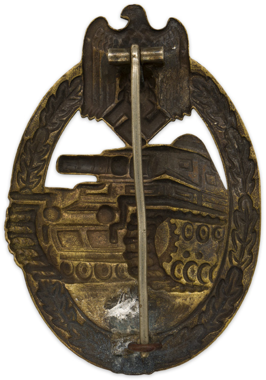 PHYSICAL DESCRIPTION: Nicely detailed, die stamped, hollow backed, tombak award with a bronze washed finish is in the form of an embossed, vertically oval oak leaf wreath with a Wehrmacht style eagle with down swept wings, superimposed to the top center, encompassing the forward profile of a tank. The reverse of the badge is a mirror image of the obverse. The reverse has a crimped, soldered hinge, a thin round vertical pin and a soldered catch all intact.