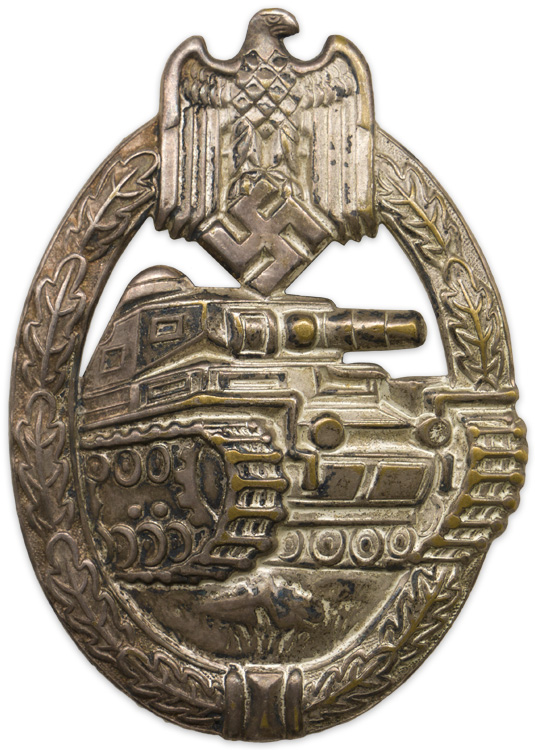 PHYSICAL DESCRIPTION: Nicely detailed, die stamped, hollow backed, alloy construction award with a nickle/silver plate. The badge is in the form of an embossed, vertically oval, oak leaf wreath with a Wehrmacht style eagle with down swept wings, clutching a canted swastika in it’s talons, superimposed to the top center, encompassing the cut out, forward profile of a tank. The wreath, eagle and tank all show nice detailing. The reverse of the badge is a mirror image of the obverse and has a crimped, soldered, hinge, a thin round vertical pin and complete catch.