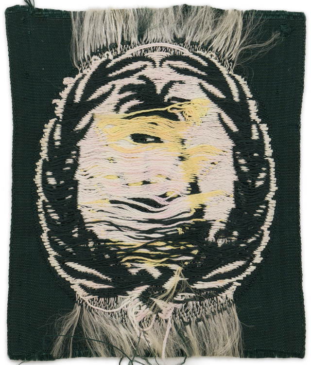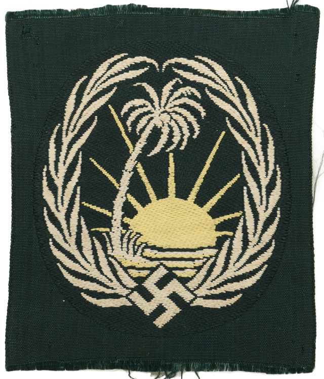 PHYSICAL DESCRIPTION: Distinctive machine woven identification badge indicating membership in Sonderverband 287, (Special Unit 287). Badge is in the form of a vertically oval dark blue/green woven ribbed rayon base with machine woven likeness of a palm tree in white partially superimposed on a yellow rising sun and encompassed by a white palm tree leaf wreath with a canted swastika to bottom center. Hard to find original!