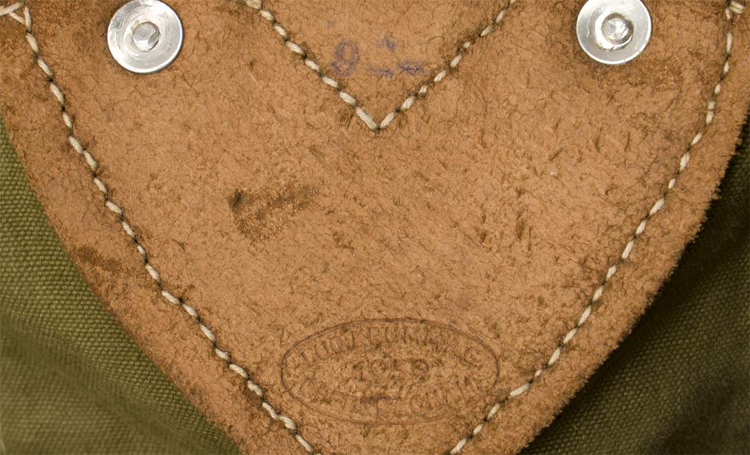 PHYSICAL DESCRIPTION: Coarsely woven, olive drab canvas construction Mountain Trooper’s M31 combat rucksack with leather, steel and alloy fittings. All complete and in superb condition. Maker marked and dated for 1937. Nice early pre-war example!