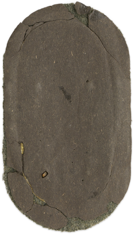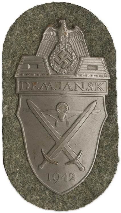 PHYSICAL DESCRIPTION: Die stamped sheet metal construction, scalloped sided, shield with a silver wash. The shield features an embossed, stylized national eagle with down-swept wings, clutching a wreathed, canted, swastika in it’s talons to the top center, positioned above an embossed, defensive bulwark with the embossed script, "Demjansk" which in turn is situated above a face-on, likeness of an aircraft, flanked by crossed swords with the embossed date "1942" to the bottom. The shield is mounted on a field-grey wool base with an alloy base plate and a protective paper backing both intact. The field-grey wool base indicates Army issue.