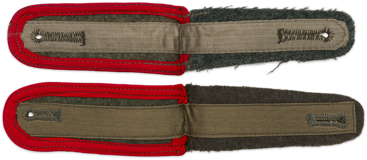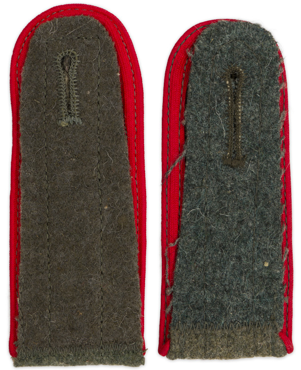 PHYSICAL DESCRIPTION: Late war, (Circa September 1944 May 1945), pattern slip on shoulder straps of reworked, mottled, field grey wool/rayon blend material with red rayon waffenfarbe piping. The bottoms of the shoulder straps and the slip on retaining tongues have a central, grey rayon reinforcement strip machine stitched in place and the waffenfarbe is also visible on the bottom of the straps. Slightly