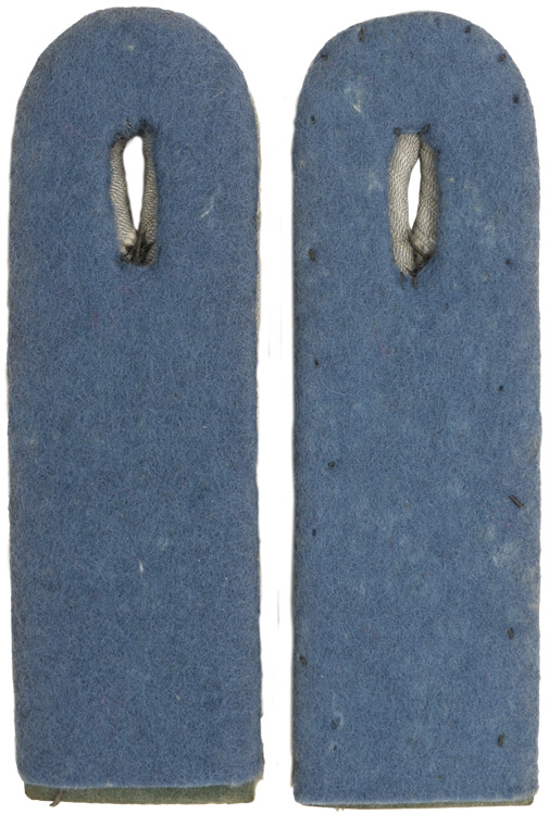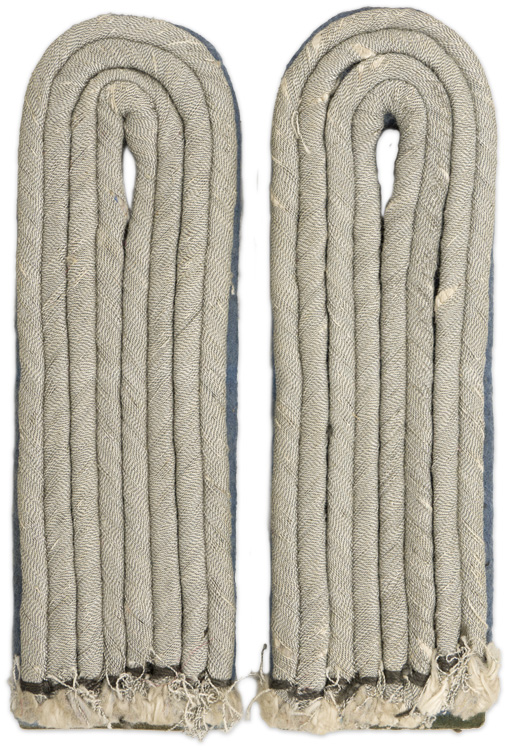 PHYSICAL DESCRIPTION: Sew on shoulder boards of silver/aluminum Russian braid mounted on blue wool waffenfarbe bases.