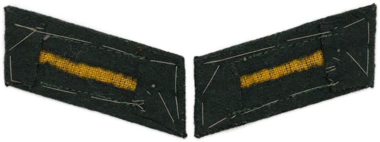 PHYSICAL DESCRIPTION: Second pattern general issue EM/NCO’s collar tabs as introduced on May 9TH 1940 for wear by all branches of service. The machine woven collar tabs feature light grey/green ribbed litzen with mouse grey branch of service and center stripes. The collar tabs are machine stitched to blue/green badge cloth/wool bases, which are mounted on a light buckram backings.