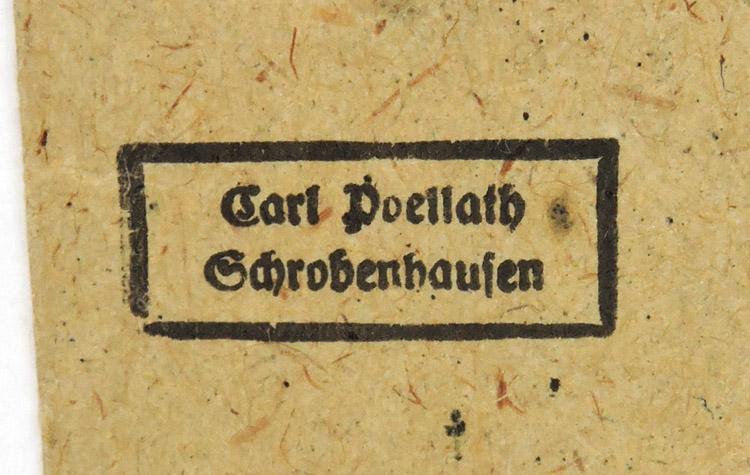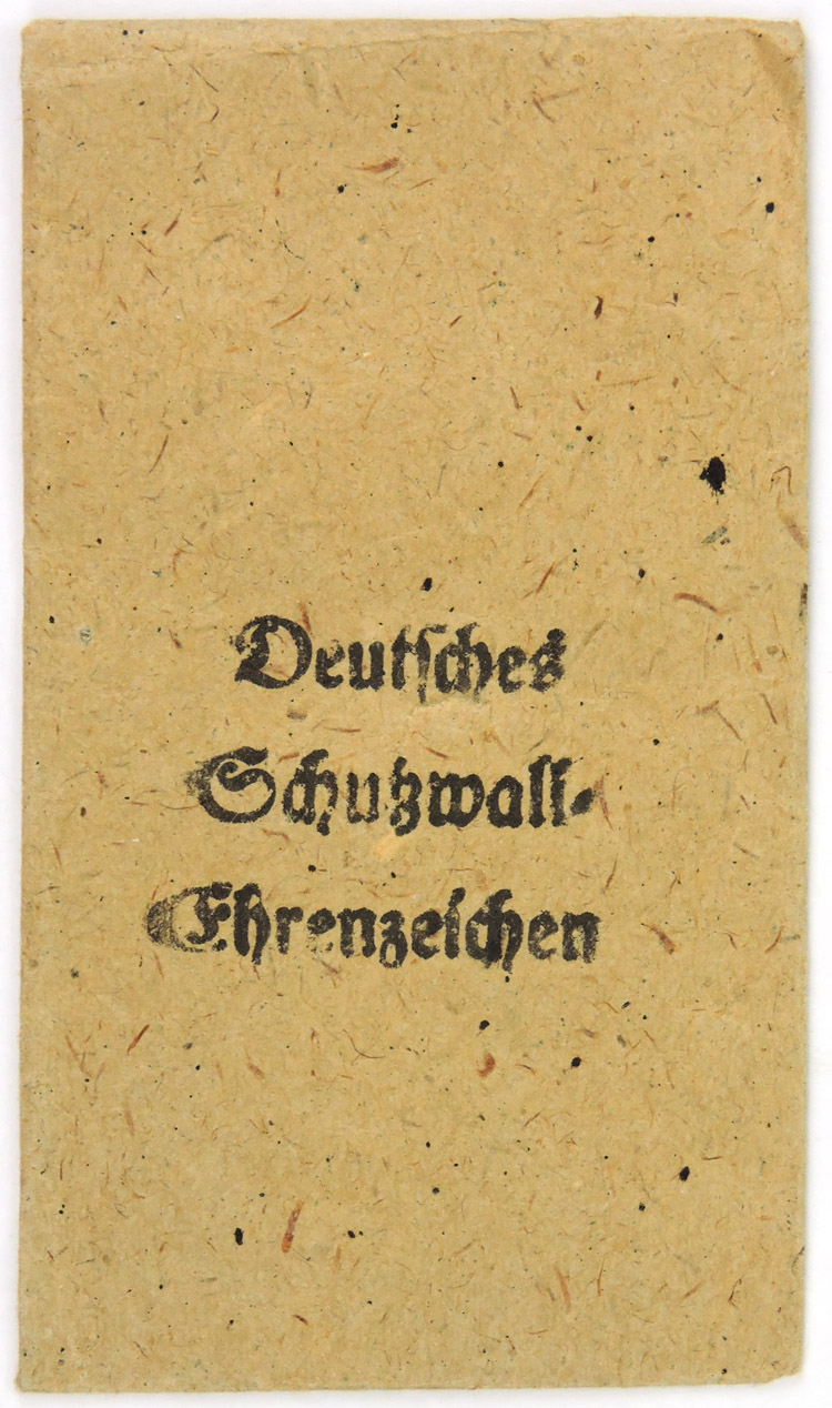 PHYSICAL DESCRIPTION: Die struck, bronze alloy construction medal with a bronze wash is in the form of a vertical oval with an embossed, oak-leaf wreath edging encompassing a smooth field with an embossed national eagle with out-stretched wings, clutching a wreathed, canted swastika in its talons, positioned above a crossed spade and sword which are in turn positioned above a pillbox to the obverse. The reverse also has the embossed, oak-leaf wreath edging which encompasses embossed, Latin script, "Für Arbeit zum Schutze Deutschlands", (For Work on the Defenses of Germany), on a smooth background field. The medal loop and the ribbon suspension ring are both intact but the ribbon is absent. The medal has no visible manufacturer’s markings. Comes complete with a light weight, natural tan cardstock, issue envelope with black printed Gothic script in three lines to the obverse, "Deutsches Schutzwall-Ehrenzeichen", (German Defense Wall Honor Award). Top edge of the envelope has a fold over, triangular flap which inserts into a horizontal slash on the envelops reverse for secure closure. Reverse of envelope has black printed Gothic scripted manufacturer's name and location, "Carl Poellath Schrobenhansen".