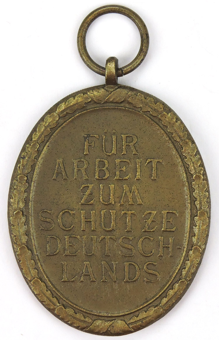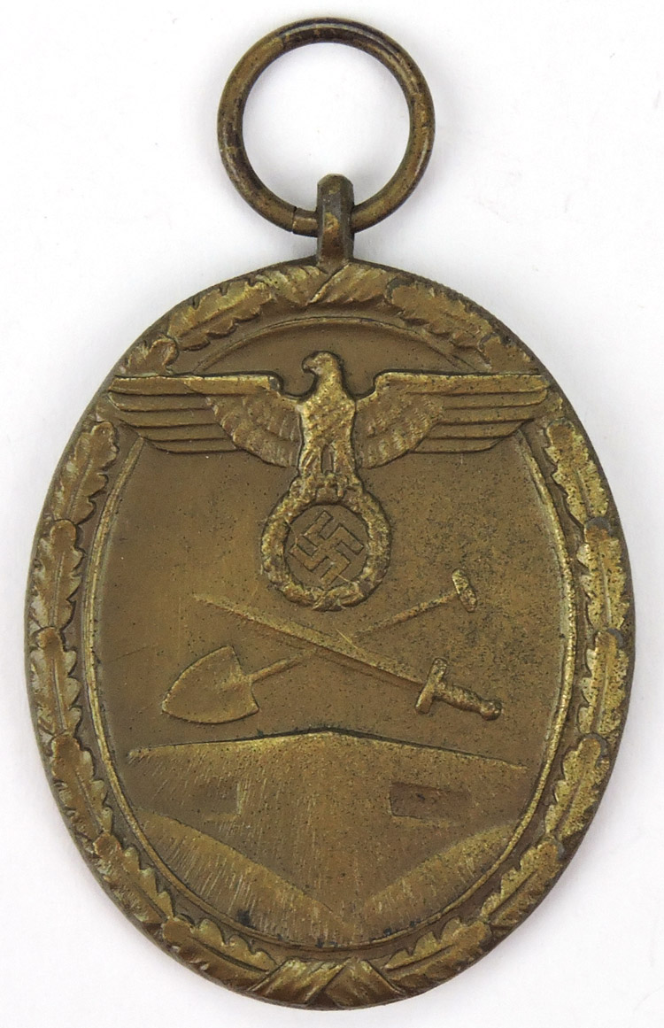 BACKGROUND: The West Wall Medal was instituted by Adolf Hitler on August 2ND 1939 to recognize military personnel, including civilian employees, who assisted in the planning, construction or defence of German fortifications on the western border. Personnel who had been awarded the October 1ST, and/or the Memel Commemorative Medals were ineligible for award of the West Wall Medal. The original bestowal of the West Wall Medals ceased as of January 1ST 1941. On October 10TH 1944, bestowal of the West Wall Medal was re-instituted as over 200,000 personnel were assigned to strengthen the German fortifications in anticipation of the western allies break-through into Germany. The West Wall Medal was only issued in one class and was to be worn on the left breast suspended from a ribbon.