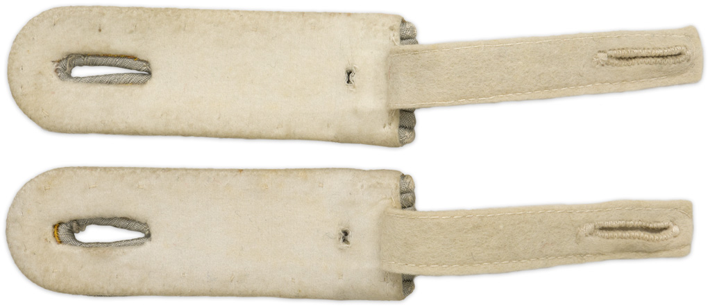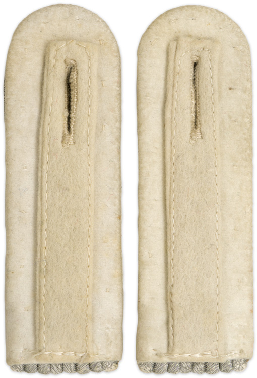 PHYSICAL DESCRIPTION: Slip on shoulder boards of matte, silver/aluminum Russian braid mounted on white wool waffenfarbe bases. Looks like they had a rank pip removed at some point.