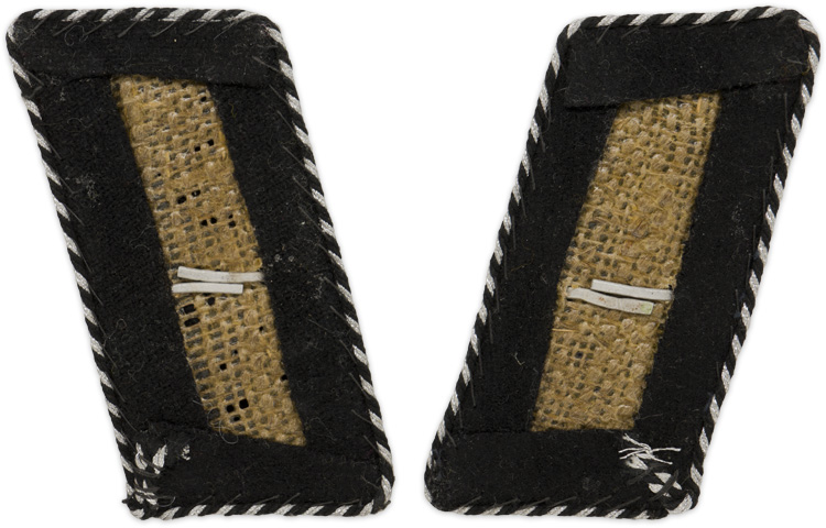 PHYSICAL DESCRIPTION: Nice quality, elongated, rectangular, fine, black wool construction collar tabs with twisted silver and black waffenfarbe piping and a, silver washed, stamped alloy, construction Prussian "Danziger" style skulls and crossbones to each. The skulls and crossbones both feature circular eye and nose cut-outs, embossed cranium detailing and dual rows of teeth with no bottom jaw. The collar tabs are mounted on tan buckram backings and the waffenfarbe edging is visible to the reverse. Rare!
