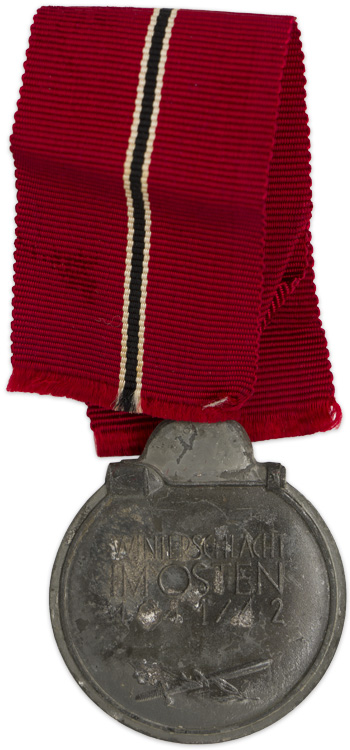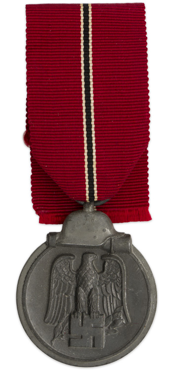 PHYSICAL DESCRIPTION: Die struck, alloy construction, medal with a silver washed outer rim and helmet, and a blued center. The obverse of the medal features a recessed outer rim with an embossed helmet and stick grenade to the top center and a high relief Wehrmacht style national eagle with down swept wings, clutching a static swastika in its talons which is superimposed on a laurel leaf sprig to the center. The reverse of the medal features a recessed outer rim with a smooth background field with embossed Latin script to the center, "Winterschlacht Im Osten 1941/42", (Winter Battle in the East 1941/42), above a crossed sword and laurel leaf sprig. The medal loop and the ribbon suspension ring are both intact. The cross comes complete with a piece of original ribbed rayon ribbon.