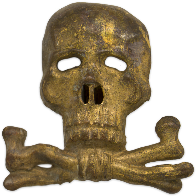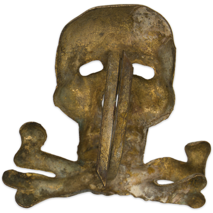 PHYSICAL DESCRIPTION: Roughly 30mm tall, 28mm wide, silver washed, die stamped alloy construction Officers pattern, Brunswick style skull and crossbones features a "face on", skull with two rows of teeth with the jaw bone resting on two, diagonally angled, crossed femur bones. The skull features embossed and recessed detailing, dual, horizontally oval, eye cut outs and dual, vertically oval nose cut outs. The reverse of the insignia is a mirror image of the obverse and has both of the original, soldered, attachment prongs is still intact. The insignia has no visible manufacturer’s markings. Scarce traditions cap badge. Nice!