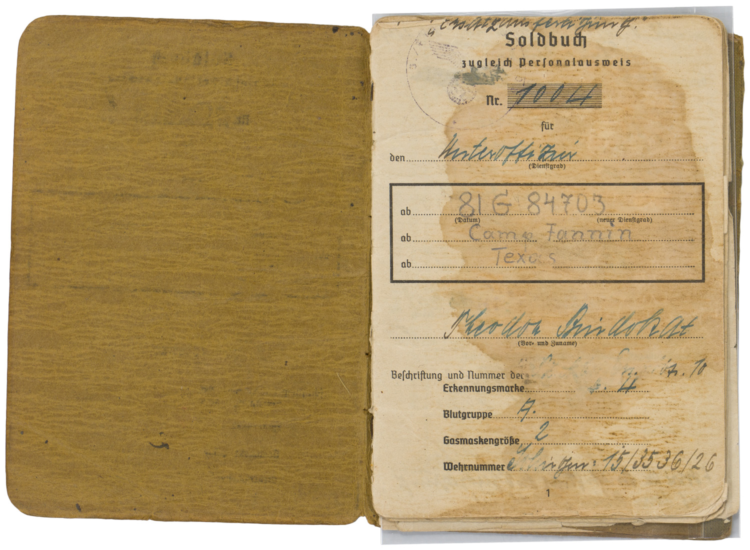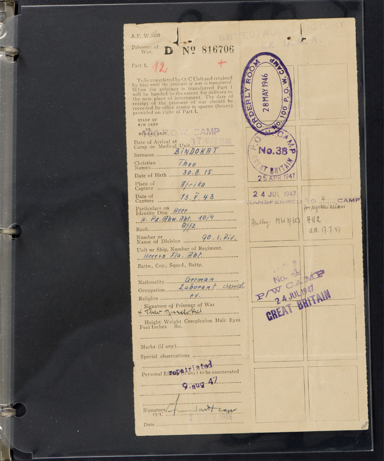 PHYSICAL DESCRIPTION: Afrika Korps Soldbuch. Exceptional true Afrika Korps Panzer Soldbuch complete with all pages (no photo, which is correct for this period of the war photos were not added until well after this man was taken POW in North Africa.) Man served in the 21st Panzer Division, in the unit which used 88 mm flak guns towed by halftracks as direct fire assault artillery. This is the unit which got the farthest east and closest to Alexandria, Egypt in the battle for El Alamein before being called back to the main German Army. This man fought in all the major battles of the Afrika Korps, including El Alamein, Bir Hakeim and Tobruk. His awards entered are: EKII for Bir Hakeim, EKI, EXTREMELY RARE Armband AFRIKAKORPS, Panzer Assault Badge and Italian Commemorative Medal. Grouping includes a number of photos in tropical uniform and of Tobruk (pencil written on reverse) and his POW documents with several photos, including one still wearing the tropical Army tunic he was captured in!