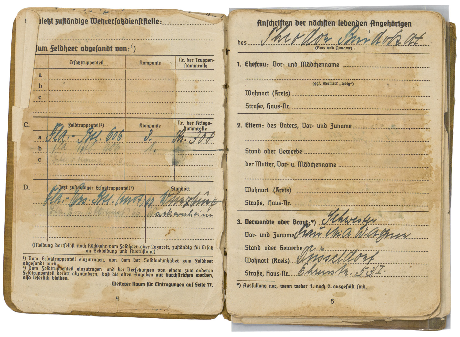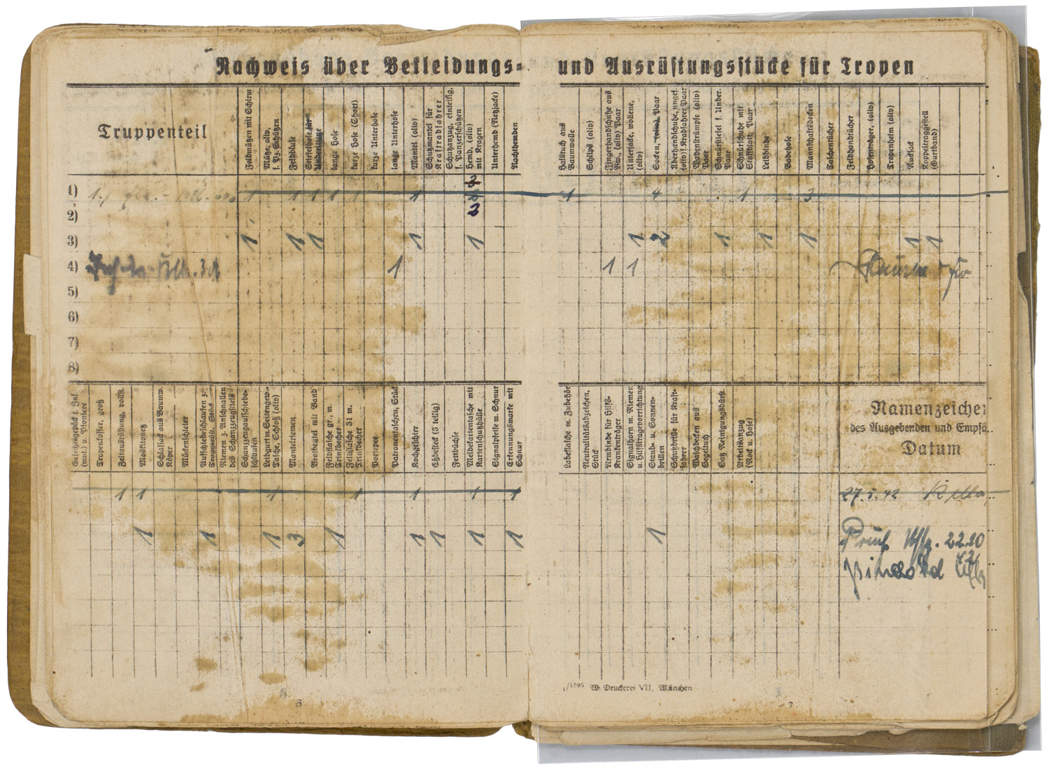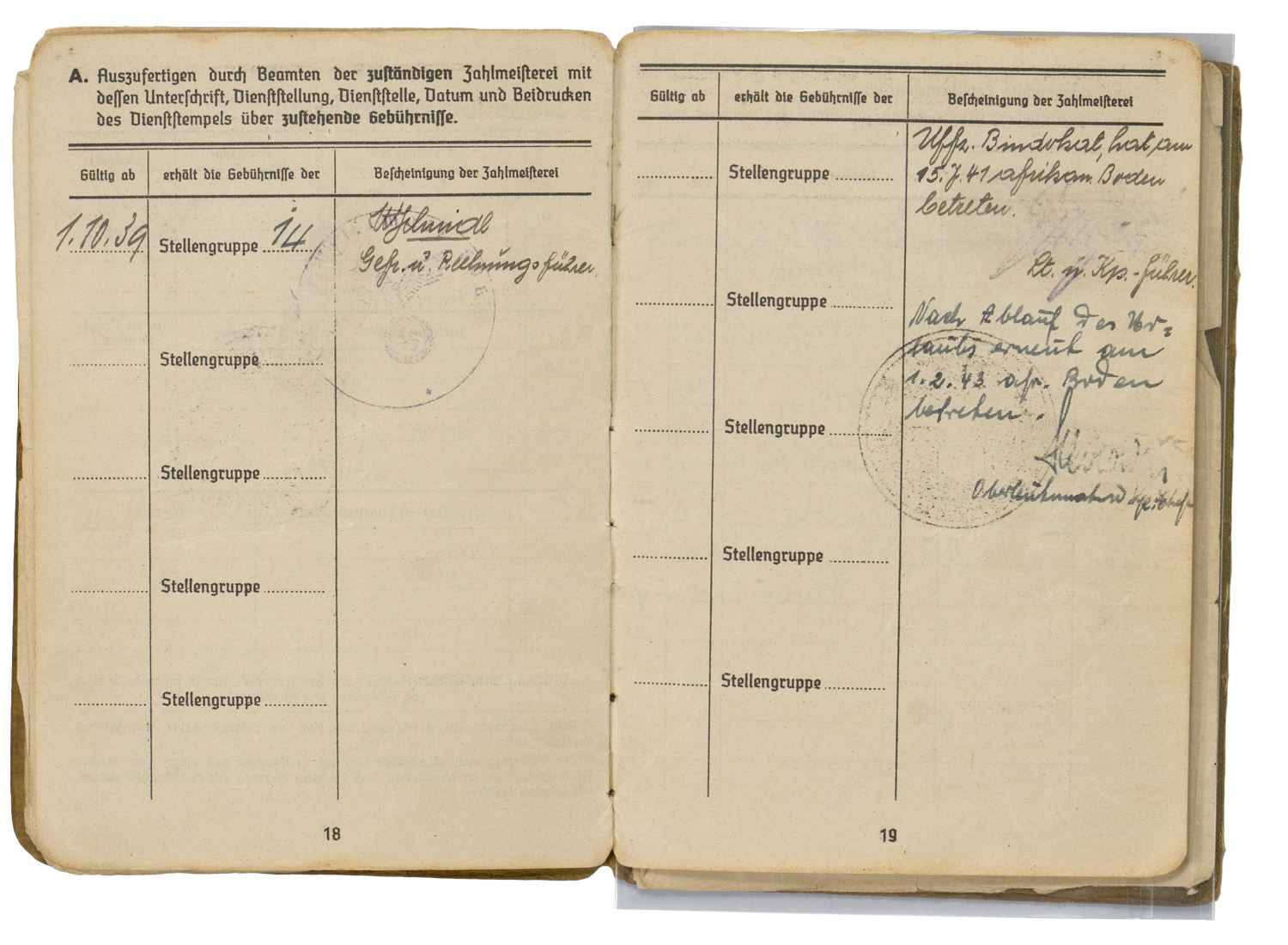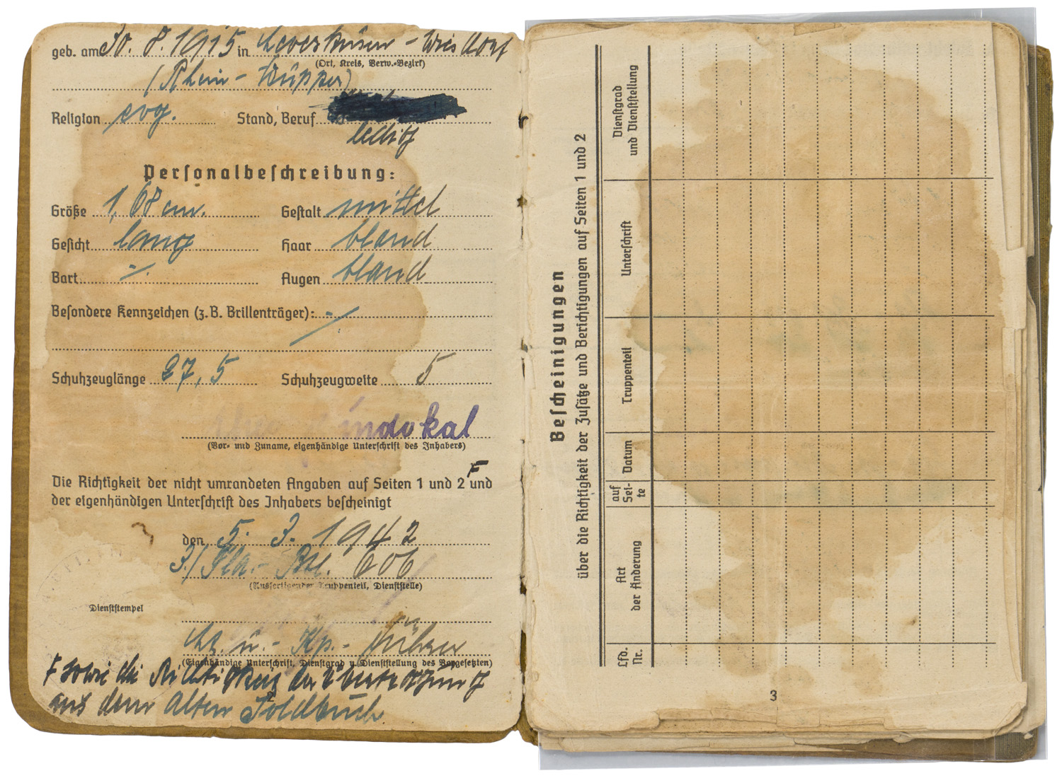 BACKGROUND: With the reintroduction of conscription in 1935, the OKW, Oberkommando der Wehrmacht, (High Command of the Armed Forces), activated the WEDs, Wehrersatzdienststelle, (Recruiting Offices), throughout Germany to process and administer the call up procedure. When individuals received their registration notice they were to report to the appropriate recruitment center where they would be issued a Wehrpass, (Military Pass), until they were inducted into active duty. Starting in the autumn of 1939, when an individual was inducted into active military service the Wehrpass was exchanged at the recruitment office for the Soldbuch, (Pay Book), which remained in the recipient’s possession as his official military identification document. The recruitment office would retain the Wehrpass and chronicle the individual’s active service record in it. Generally if the individual was killed in battle the Wehrpass would be forwarded to his next of kin as a memento of his service time, while the Soldbuch would be returned to the appropriate WEDs, Wehrersatzdienststelle, (Recruiting Offices), for inclusion in the individual’s official records. Regulations concerning handling of the Soldbuch were quite strict and although an individual had to present his Soldbuch to higher ranking, military police and guard personnel, as requested, the Soldbuch was not to leave the owner’s sight and be returned immediately after examined. The only instance, besides death, that regulations permitted a Soldbuch to leave the recipient’s possession was in the case of legal arrest. Of Note: Heer, (Army), Luftwaffe, (Air Force), and Waffen SS, Schutz Staffel, (Armed Protection Squad), security and precaution regulations to have a photograph of the recipient placed in the Soldbuch wasn’t enacted until mid November 1943, while Kriegsmarine, ({War} Navy), regulations decreed the Soldbuch's were to have the recipient’s photograph applied as early as September 1941. The Heer, Luftwaffe and Waffen SS regulations stated that training units have the photographs applied in the Soldbuch by April 1944 and combat units by December 1944, although the regulations were not always strictly adhered to. Of Interest: The Reich conscription laws of 1935 dictated that each of the three branches of service would be allocated a percentage of the available recruits according to their manpower requirements with the Heer being allotted the lions share of roughly 66% of eligible personnel followed by the Luftwaffe who were accorded roughly 25% with the Kriegsmarine receiving the remaining 9% of personnel. Also Of Interest: In January 1945 the Ergänzungsstelle der Waffen SS was combined with the army’s Wehrersatzdienststelle and was renamed Ergänzungsstellen des Heeres und der Waffen SS, (Replacement Centers of the Army and the Armed SS). Also Of Note: It appears that the majority of Soldbuch's and Wehrpass's were manufactured by the Metten & Co, Nationaler Werbedruck firm of Berlin SW 61, "Metten & Company National Recruiting/Enlistment Printing 61 Southwest Berlin).