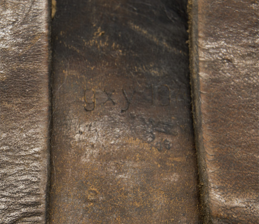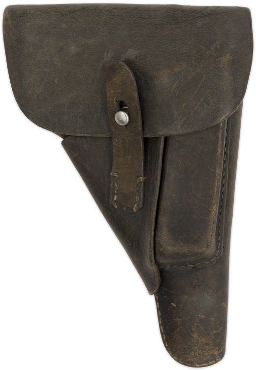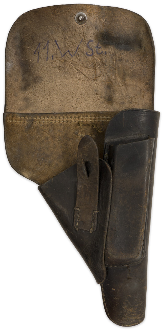PHYSICAL DESCRIPTION: Blackened leather construction holster with steel fittings features a fold over top flap with a sewn on vertical leather closure strap with a single stud eyelet to the obverse. The right front of the holster body also has a stitched on, spare magazine pocket. Belt loops complete. Nicely maker marked "gxy 1944". Scarce.