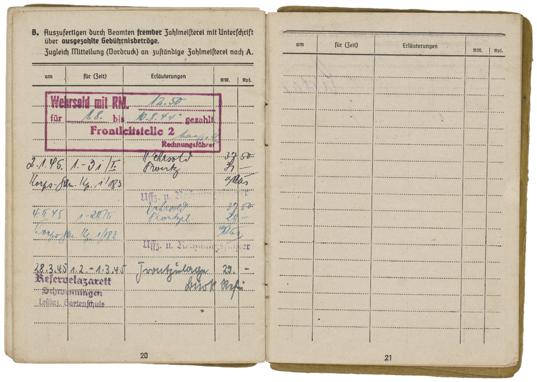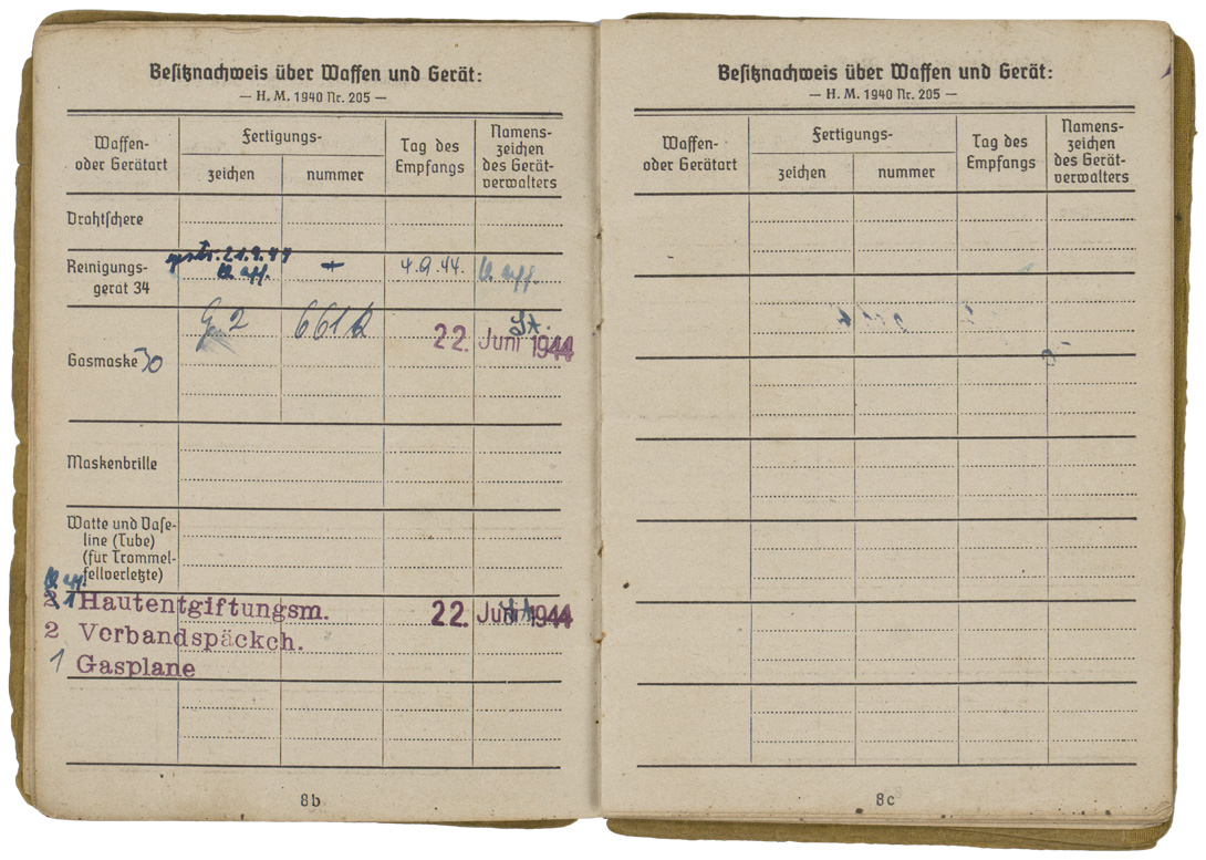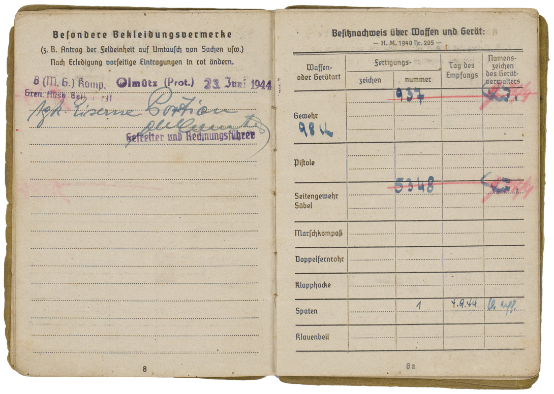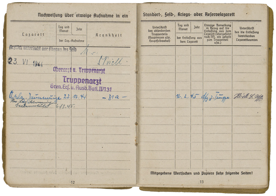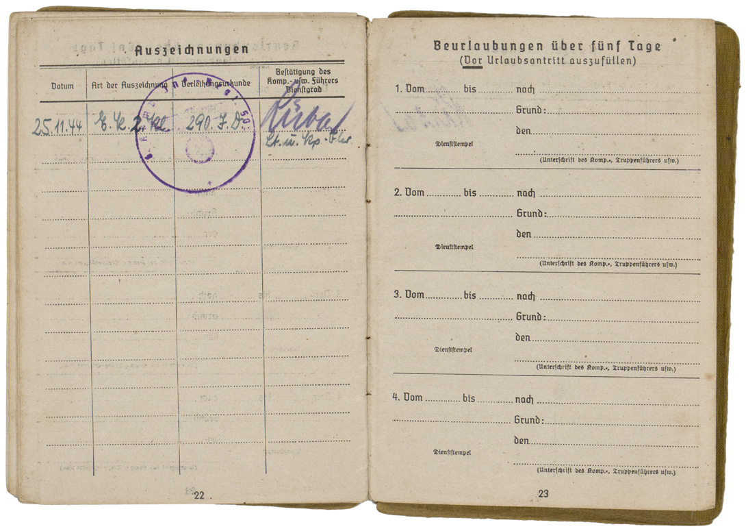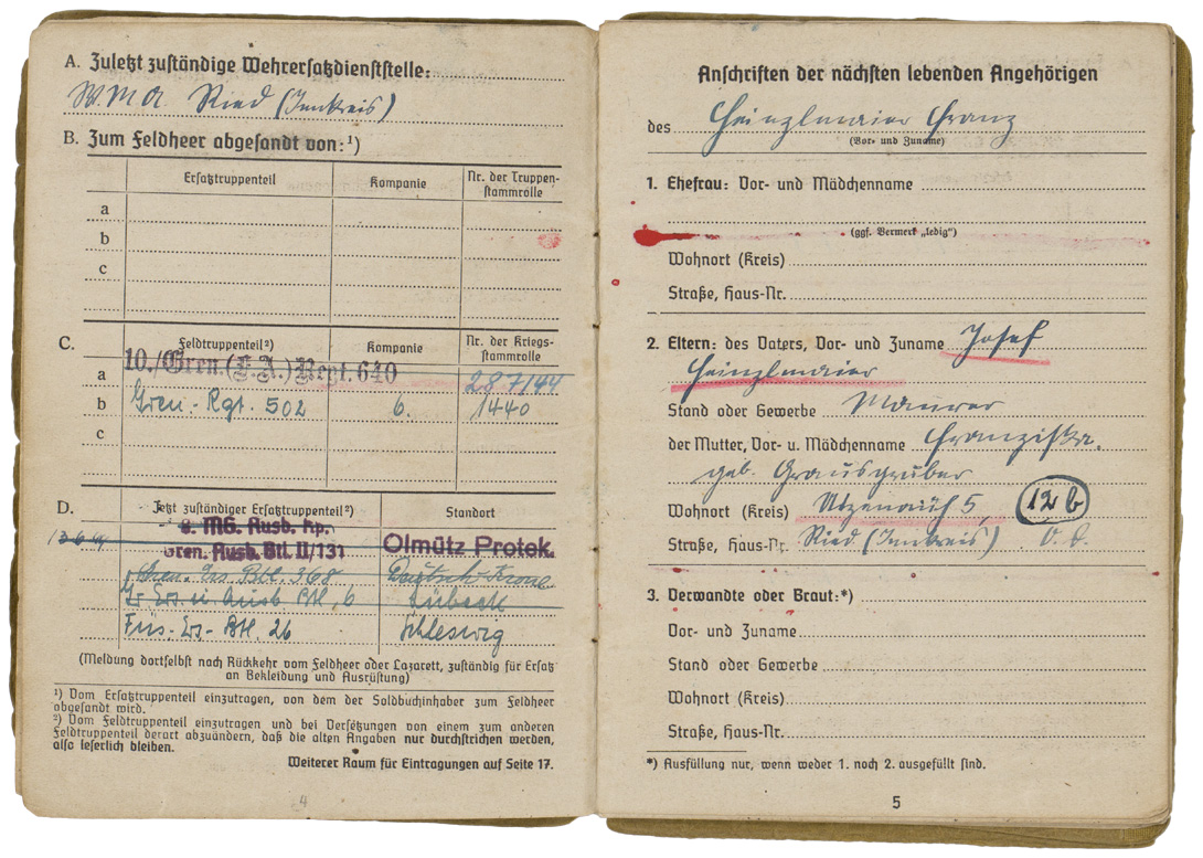 PHYSICAL DESCRIPTION: WW2 German Army Soldbuch. Carried by Gefreiter Franz Heinzlmaier, who was age 17 when he arrived on the Russian Front. Born 12 November 1926, Soldbuch started 15 June 1944. He served in the 8th (Machine Gun) Kompanie of Grenadier Regiment 502 of the 290th Infantry Division (Army Group North) which used an upright sword as its regimental insignia. Heinzlmaier earned the Iron Cross Second Class on November 25, 1944 and the Soldbuch has the comparatively rare entry for a bullet wound (31A) on 22 December 1944 but the war ended before he was awarded the Wound Badge in Black. More than 95 percent of wound entries in Soldbuecher are 31D (shrapnel) reflecting the overwhelming role of artillery in WW2, especially on the Russian Front. The wound saved Heinzlmaier’s life -- he was evacuated to a hospital in Germany and not captured by the Soviet Army as was most of the 290th ID (which was tantamount to a death sentence in Siberia). Denazified cover (cover only: the pages are not denazified). Never had a photo, all pages present and intact, some minor documents tucked into the rear cover pocket. Nice Soldbuch to a young Russian Front soldier.