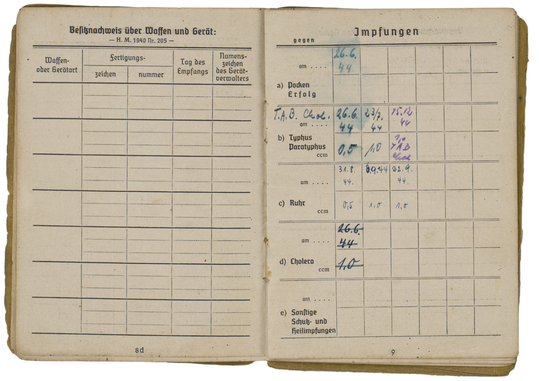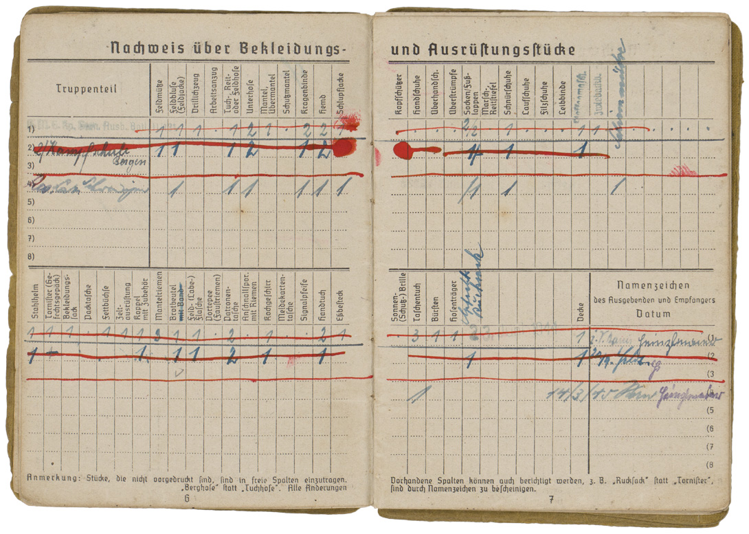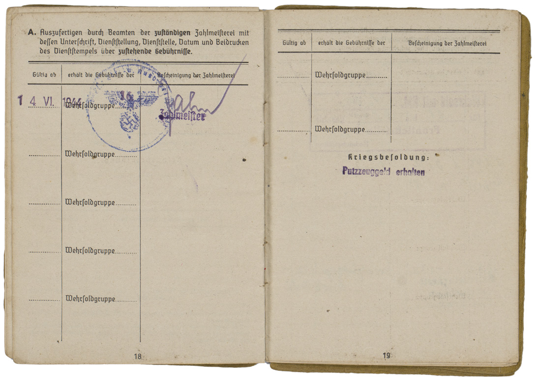 BACKGROUND: With the reintroduction of conscription in 1935, the OKW, Oberkommando der Wehrmacht, (High Command of the Armed Forces), activated the WEDs, Wehrersatzdienststelle, (Recruiting Offices), throughout Germany to process and administer the call up procedure. When individuals received their registration notice they were to report to the appropriate recruitment center where they would be issued a Wehrpass, (Military Pass), until they were inducted into active duty. Starting in the autumn of 1939, when an individual was inducted into active military service the Wehrpass was exchanged at the recruitment office for the Soldbuch, (Pay Book), which remained in the recipient’s possession as his official military identification document. The recruitment office would retain the Wehrpass and chronicle the individual’s active service record in it. Generally if the individual was killed in battle the Wehrpass would be forwarded to his next of kin as a memento of his service time, while the Soldbuch would be returned to the appropriate WEDs, Wehrersatzdienststelle, (Recruiting Offices), for inclusion in the individual’s official records. Regulations concerning handling of the Soldbuch were quite strict and although an individual had to present his Soldbuch to higher ranking, military police and guard personnel, as requested, the Soldbuch was not to leave the owner’s sight and be returned immediately after examined. The only instance, besides death, that regulations permitted a Soldbuch to leave the recipient’s possession was in the case of legal arrest. Of Note: Heer, (Army), Luftwaffe, (Air Force), and Waffen SS, Schutz Staffel, (Armed Protection Squad), security and precaution regulations to have a photograph of the recipient placed in the Soldbuch wasn’t enacted until mid November 1943, while Kriegsmarine, ({War} Navy), regulations decreed the Soldbuch's were to have the recipient’s photograph applied as early as September 1941. The Heer, Luftwaffe and Waffen SS regulations stated that training units have the photographs applied in the Soldbuch by April 1944 and combat units by December 1944, although the regulations were not always strictly adhered to. Of Interest: The Reich conscription laws of 1935 dictated that each of the three branches of service would be allocated a percentage of the available recruits according to their manpower requirements with the Heer being allotted the lions share of roughly 66% of eligible personnel followed by the Luftwaffe who were accorded roughly 25% with the Kriegsmarine receiving the remaining 9% of personnel. Also Of Interest: In January 1945 the Ergänzungsstelle der Waffen SS was combined with the army’s Wehrersatzdienststelle and was renamed Ergänzungsstellen des Heeres und der Waffen SS, (Replacement Centers of the Army and the Armed SS). Also Of Note: It appears that the majority of Soldbuch's and Wehrpass's were manufactured by the Metten & Co, Nationaler Werbedruck firm of Berlin SW 61, "Metten & Company National Recruiting/Enlistment Printing 61 Southwest Berlin).
