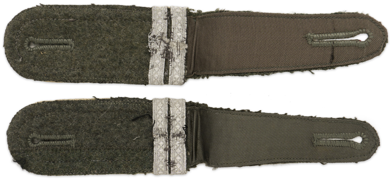PHYSICAL DESCRIPTION: Later, second pattern, (circa May 1940), field-grey wool construction, slip on shoulder straps with diamond pattern, NCO tress to all but the slip on end and white rayon waffenfarbe. The shoulder straps also have the addition of two, bright, silver/aluminum diamond patterned NCO’s tress loops to the slip on end. The shoulder straps indicates the rank of Unteroffizier while the additional tress loops indicate the owner was an Offizieranwärter, (Officer Aspirant).
