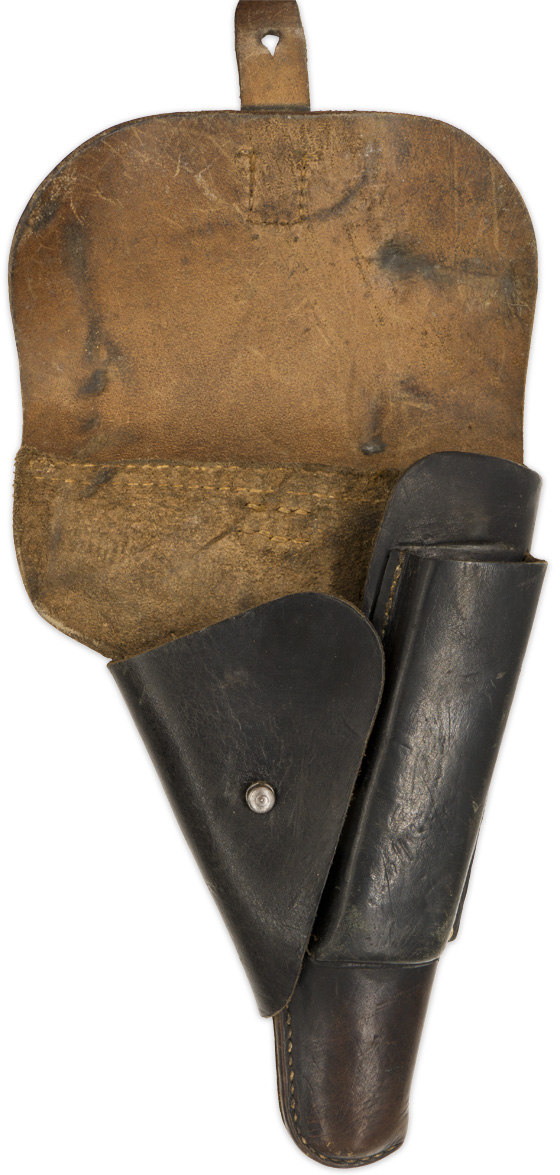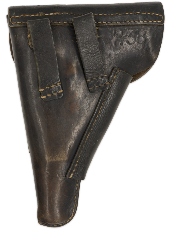 PHYSICAL DESCRIPTION: Second pattern, molded, blackened leather construction, P38 "softshell" holster. The holster features a fold over top flap with a horizontal stitched hinge to the reverse and a stitched on vertical leather closure strap to the obverse. The top flap closure strap attaches to a natural steel stud that is situated on a fold back panel to the left hand side of the holster body. The holster body also has a stitched on, spare magazine pocket to the right front. The reverse of the holster has two slightly diagonally angled stitched on leather belt loops. Faint maker mark to reverse.