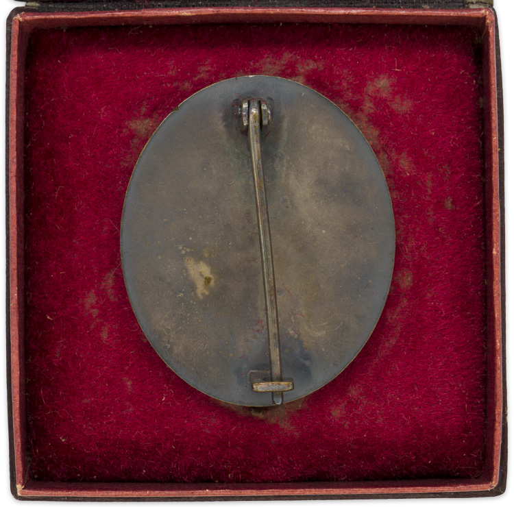 PHYSICAL DESCRIPTION: 1939 pattern, die struck, alloy construction, solid backed badge with a silver wash. The badge is in the form of an embossed, vertically oval, laurel leaf wreath encompassing an embossed profile of a M35 pattern helmet with a high relief, canted, swastika to the center, superimposed over crossed swords on a pebbled base field. Complete pin and catch assembly. Badge is unmarked. Complete with original case.