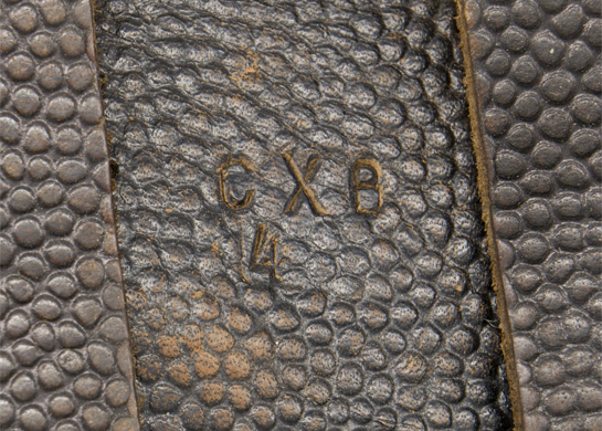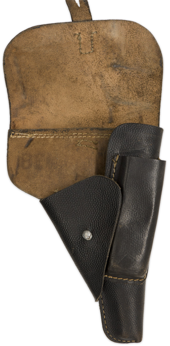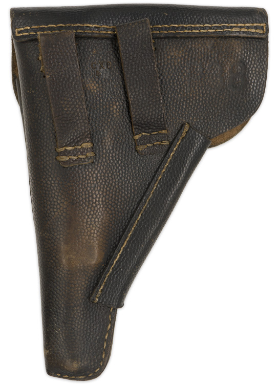 PHYSICAL DESCRIPTION: Second pattern, molded, blackened pebbled, leather construction, P38 "softshell" holster. The holster features a fold over top flap with a horizontal stitched hinge to the reverse and a stitched on vertical leather closure strap to the obverse. The top flap closure strap attaches to a natural steel stud that is situated on a fold back panel to the left hand side of the holster body. The holster body also has a stitched on, spare magazine pocket to the right front. The reverse of the holster has two slightly diagonally angled stitched on leather belt loops. The reverse of the holster is well marked with impressed designation, "P38", a Waffen-amt stamp and the manufacturers three letter code "exe".