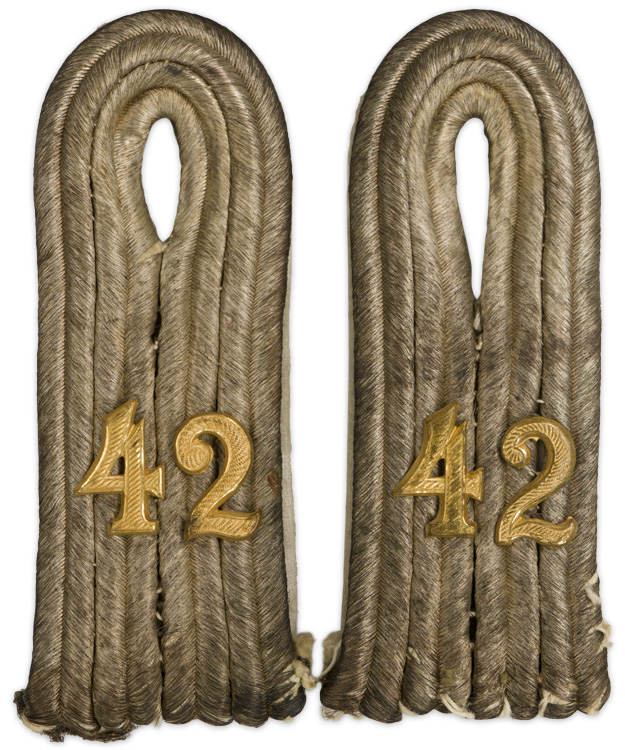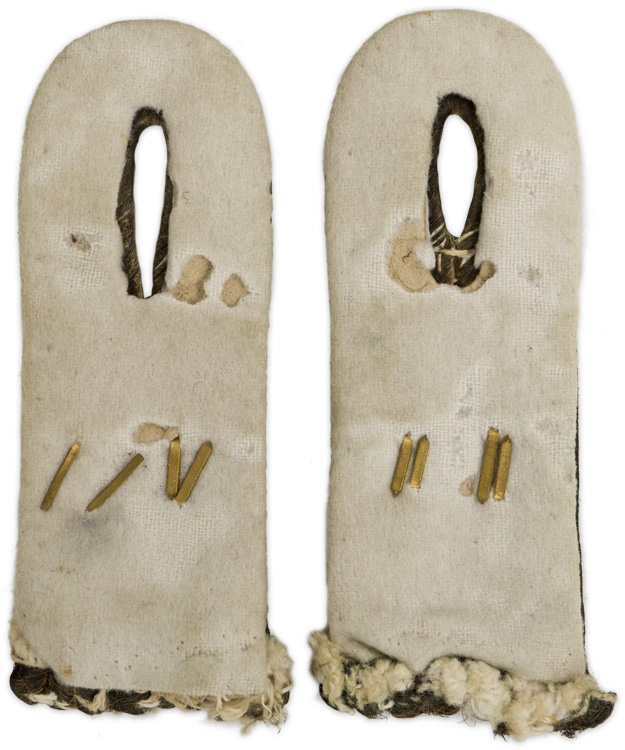 PHYSICAL DESCRIPTION: Early pre-war sew on shoulder boards of silver/aluminum Russian braid mounted on white wool waffenfarbe bases. Stamped numeral cyphers, "42" (42nd Infantry Rgt).