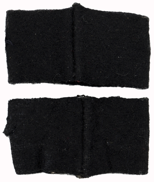 PHYSICAL DESCRIPTION: Black wool construction shoulder strap slides with chain stitched regimental numerals, "100" in pink cotton threads to obverse. The black wool base and pink numerals indicate straps were issued to Panzer personnel serving with the 100TH Panzer Regiment, a component of the second 21ST Panzer Division. Original formed from components of the 5TH Leichte Division, the first 21ST Panzer Division served in north Africa until it was virtually destroyed in May 1943 in Tunisia. In July 1943 remnants of the division were reformed into the second 21ST Panzer Division in Normandy with the 100TH Panzer Regiment. This second 21ST Panzer Division was equipped with French tanks and fought in Normandy against the allied invasion until August 1944 when it returned to Germany for refitting. The Division returned to the western front until late 1944 when it was transferred to the eastern front where it was destroyed by the Russians in April 1945. Small hole to the side of one of the slides. Nice match set.