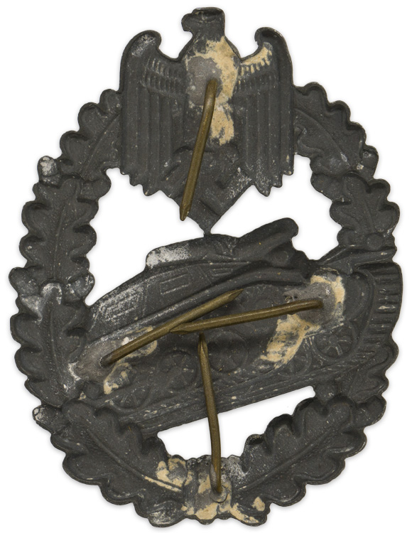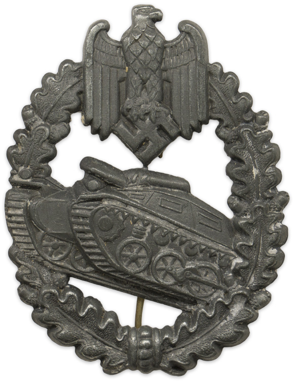PHYSICAL DESCRIPTION: Stamped, zinc alloy construction, vertically oval shield. The shield features an embossed, oak-leaf pattern wreath with a Wehrmacht style eagle with down swept wings positioned to the top center encompassing the cut-out, left forward profile of a Panzer I. All four reverse prongs are intact.