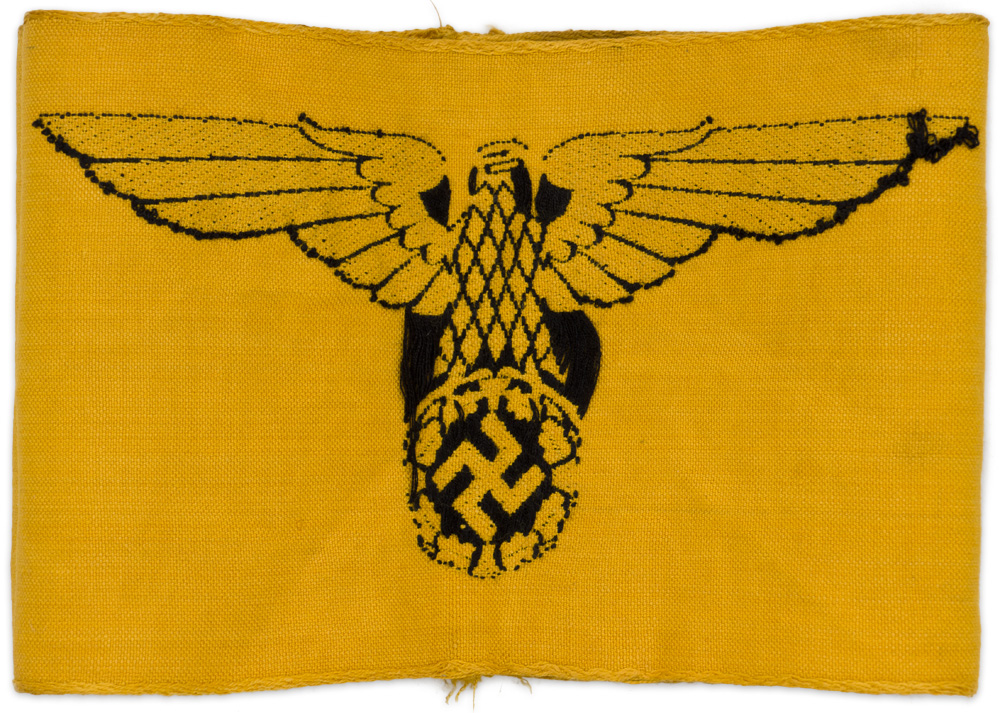 PHYSICAL DESCRIPTION: Woven golden yellow cotton construction armband with a black, machine woven, stylized national eagle with out-stretched wings, clutching a wreathed, canted swastika in its talons to the obverse center. The top and bottom edges of the armband have interwoven rows of reinforcement stitching and the reverse of the armband has a machine stitched, vertical, seam.