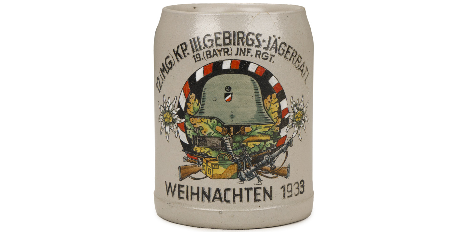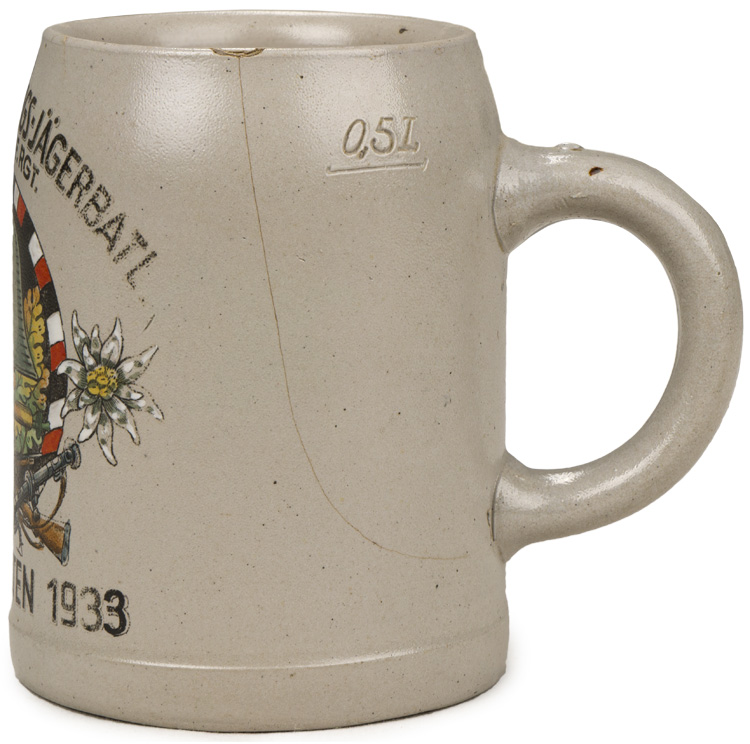 (Stein)Ceramic beer stein, 50mm tall, with commemorative markings for "12. (MG) KP. III. GERBIRGS-JÄGERBATL ", "19. (BAYR.) INF. RGT" and "WEIHNACHTEN 1933". Cavalry Recon unit. Marked "4. Schwadron - Aufkl. Abtlg. 4" Weinachten 1938. Nice large spread winded eagle to the top. An underlined ".05 L." (1/2 Liter) mark is inscribed to the upper left facing side. Excellent condition with the expected light age. Nice.