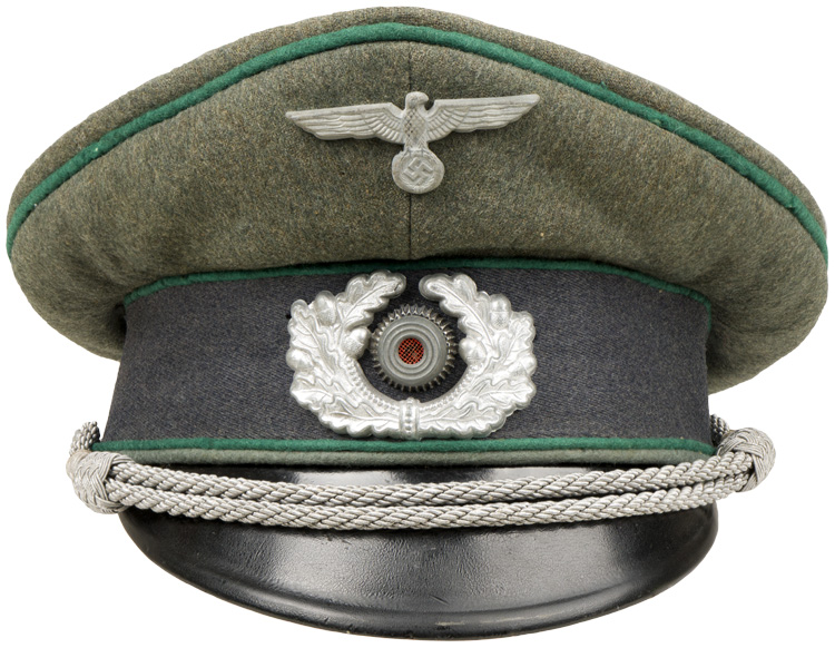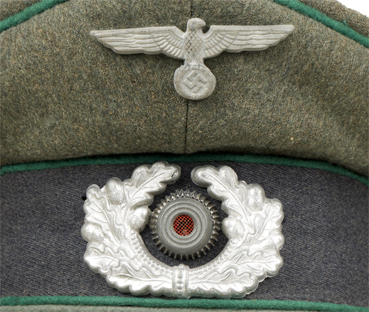 BACKGROUND: Visor caps were a standard item for all personnel during the Third Reich period and regulations dictated the form of dress they were to be worn with based on the individuals rank. Officers and certain senior NCO ranks were responsible for purchasing their own caps and as a result were allotted a clothing allowance through the army’s Kleiderkasse, (Clothing Account), system. The Officers and certain senior NCO’s could choose to purchase their caps from the armed forces clothing depots or to privately purchase visor caps of higher quality. Although enlisted personnel were issued their caps from government supplies they were also permitted to purchase privately tailored caps although the price may have been restrictive. Originally the insignia worn on the visor caps consisted the Weimar Reichsheer patterns which included a blackened leather chinstrap for all ranks. In February 1927 new chin cords for Officer ranks were introduced with silver cords for the ranks of Leutnant to Oberst and gilt cords for the ranks of Generalmajor to Generalfeldmarschall. Regulations of February 26TH 1936 also permitted senior NCO’s who were Officer Candidates to wear the Officers twisted silver/aluminum chin cord on their visor caps as opposed to the standard EM/NCO’s leather chinstrap. Of Note: Both the first pattern Reichsheer era visor cap eagle and wreath were replaced with the second pattern in March 1935. The Army Mobilization Order of March 12TH 1937 established a group of Sonderführer, (Specialist Leaders), formed from personnel with specialized knowledge and/or skills to perform specific tasks that regular military personnel were unable to fulfill. Depending on their qualifications the Sonderführers were assigned positions with the equivalent of NCO or Officers ranks although since they lacked the prerequisite military training their authority only extended to personnel serving with them in the performance of a particular task or function. The Sonderführers were divided into five different position groups with each group being roughly the equivalent of a military unit running from Battalion level down to Squad level. The Sonderführers position/rank was dependant on the position group that the individual was assigned to. Originally the Sonderführers wore the standard army uniform and headgear befitting their position/rank with the appropriate identifying, waffenfarbe, (Branch of Service Color), which was generally displayed as piping on the visor cap. Regulations of July 1941 altered the waffenfarbe color of all Sonderführers to blue/grey and included altering the standard blue/green visor cap centerband color. Of Note: The German army had a tradition, dating from the 1700's, of maintaining a separate branch of Administrative Official’s attached to the army to oversee all administrative functions, thus freeing up active army Officers and allowing them to concentrate on actual military matters. The Officials were responsible for a wide variety of administrative tasks from Court Martial, Librarian, Supply, Technical and Meteorological Services, to School, Barracks, and Hospital administration. Most officials careers consisted of four varying grades, of high, elevated, medium and low grade with slightly differing identifying insignia for each grade. The grade of the career was determined by the education and/or experience of the individual. During the Reichswehr era the officials were divided into military and civilian personnel until December 22ND 1934 when the German High Command did away with the differentiation and consolidate all the officials into the newly formed Wehrmachtbeamte-Heer, (Armed Forces Officials-Army). Regulations of March 12TH 1937 reorganized the Officials and instituted the new Beamte auf Kriegsdauer a.K., (Wartime Official’s for the duration of the war), to be activated in times of mobilization. Originally the uniformed Official’s were allotted an identifying dark green waffenfarbe, (Branch of Service Color), with a nebenfarbe, (secondary color), to indicate their actual career. Regulations of March 21ST 1940, replaced the assorted nebenfarbe colors with a secondary color of light grey for all Officials regardless of career or function. In January 1944 the Army instituted a new career for officers and certain officials, entitled, TSD, "Truppensonderdienst", (Special Service). This new career used light blue waffenfarbe and did away with secondary colors as worn by Officials in the other careers.