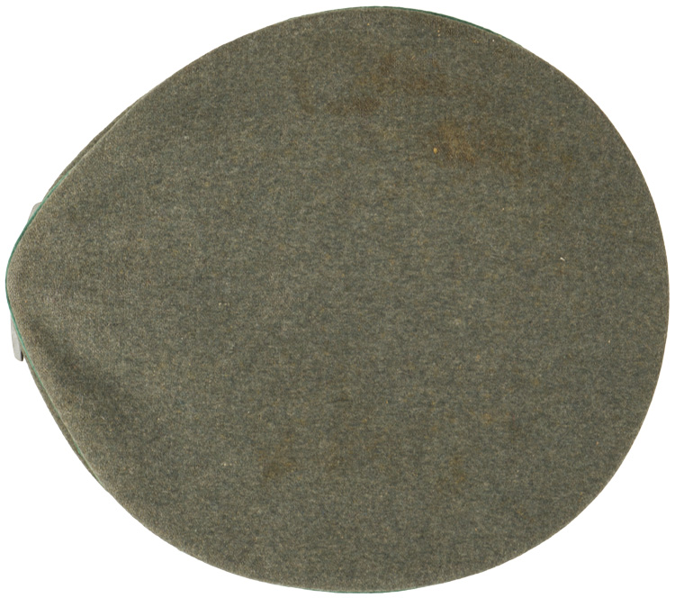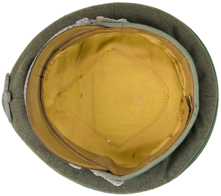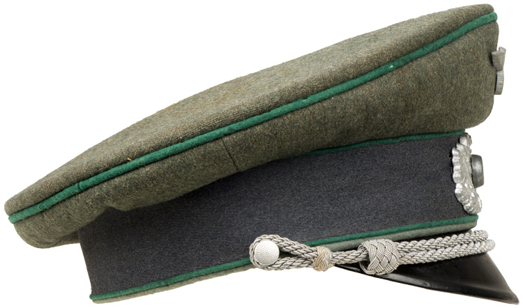 PHYSICAL DESCRIPTION: Officer’s visor cap with a, field-grey wool construction body and crown, a blue/grey wool centerband and dark green waffenfarbe piping (Beamte am Kriegsdauer und Sonderfuhrer) to the top crown edge and both the top and bottom edges of the centerband. Zinc national eagle and Erel "ventilated" pattern aluminum cockade. The cap has a bright, twisted, silver/aluminum chin cord secured in place by two, small, silver washed, pebbled, magnetic sheet metal buttons. The cap has an extended, forward, black lacquered vulcanfibre visor with a subtly raised lip to the forward edge. Stitching on the visor is starting to pull loose but is still firmly held in place. The interior centerband material is broken is several spots, but is of course not visible. The interior of the cap is fully lined in gold rayon. The interior crown lining has a clear celluloid sweat diamond which is all intact. Nice leather sweatband is complete. Roughly a size 56".