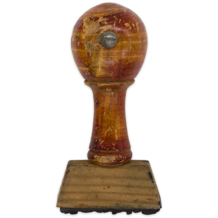 A "feldpost" stamp with wooden handle in original two piece cardboard constructed box. Original tissue paper included. Stamp measures approximately 7cm long.