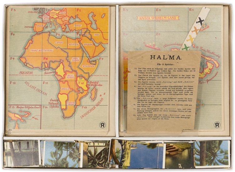 A German Board Game Deutschland Braucht Kolonien ("Germany Needs Colonies). Very rare surviving example of the board game by the famous German toy and game company Hausser Spiele in excellent condition. In the 1930’s, a German political movement sought to regain Germany’s colonial possessions confiscated after WWI. The first line of the game description inside the lid reads (in German) "In Versailles, through force and lies, our colonies were stolen from us." The game is intended to educate German children about the former colonies and their economic value to the Third Reich. Excellent condition, one of very few surviving examples. Appears to be complete. The two piece, cardboard constructed box measures approximately 4cm x 30cm x 41.5cm.