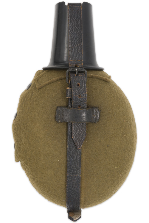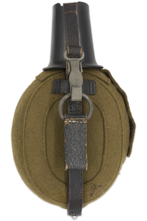 BACKGROUND: During WWII the German army fielded nine Mountain Divisions with an additional six Waffen-SS, (Armed-SS), Mountain Divisions. Generally speaking the Mountain Divisions were specially trained and equipped Infantry Divisions designed for mountainous warfare. Each Division in the German Army of WWII also had Divisional Support units which included a medical unit that normally consisted of two companies, a mobile field hospital and two ambulance platoons. Although the .8 liter capacity, M31 canteens were the standard issue canteen, mountain troops and medical personnel were issued a larger, one and a half to two liter capacity canteen that was based on the larger canteens used by their WWI counterparts. These larger mountain troops/medical canteens were of identical design to the standard M31 canteens but came equipped with a different carrying harness and shoulder strap assembly. Originally the mountain troops/medical canteens were manufactured in aluminum but later as the aluminum was required for other more critically essential items the canteens began to be manufactured in steel. With potable fluids being such an essential item for an individuals well-being the mountain troops/medical canteen must be considered as a very important piece of kit.