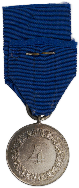 PHYSICAL DESCRIPTION: Silver washed, die struck, magnetic sheet metal construction, fourth class award for four years service, features an embossed Wehrmacht, (Armed Forces), style eagle with down swept wings, clutching a canted, swastika in it’s talons, encompassed by Gothic script, "Treue Dienste in der Wehrmacht" (Loyal Service in the Armed Forces), on a smooth background field to the obverse. The reverse has a large embossed numeral, "4" to the center encompassed by an embossed, circular, oak leaf wreath. Complete with original ribbon & eagle cypher.