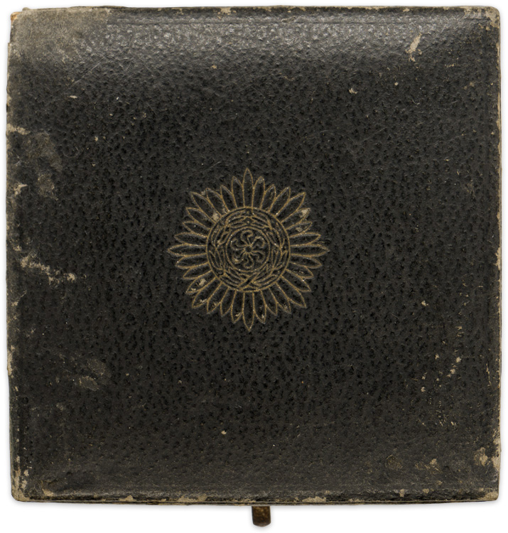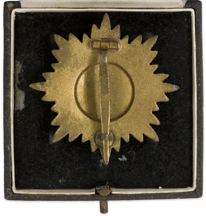 PHYSICAL DESCRIPTION: Die struck, zinc alloy construction award with a gilt wash is in the form of a thirty-two point, sunburst star pattern with a central, embossed, circular, laurel leaf wreath encompassing a six petal flower. The reverse has the typical circular depression to the center as found on these awards. Complete with original hinge, pin and catch assembly. Complete with original case.