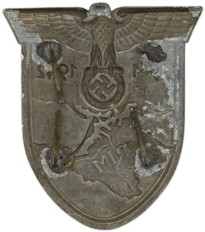 PHYSICAL DESCRIPTION: The award is in the form of a vertical, die stamped, sheet metal construction, shield with a bronze wash featuring a large embossed national eagle with out-stretched wings, clutching a wreathed, canted, swastika in it’s talons, to the top center, situated above an embossed, stylized, map of the Krim peninsula with the embossed dates, "1941-1942", and the impressed location, "Krim". The recessed "water" surrounding the peninsula has a subtly pebbled, background field. The edge of the shield has a fine, embossed, line and a stepped down outer edge. Three of the original four prongs remain.